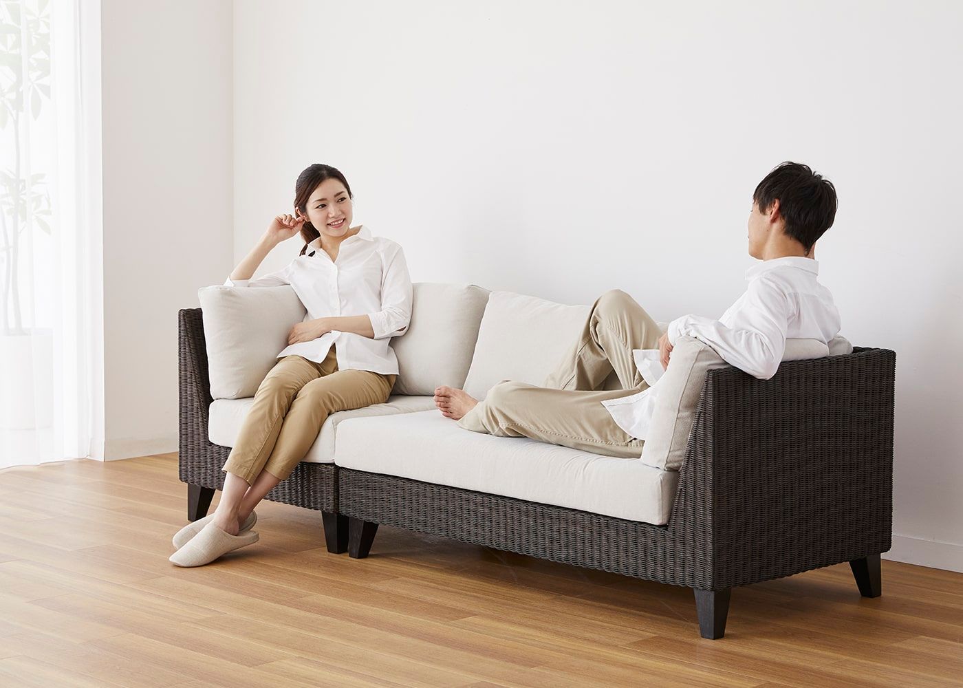 v02セットに。大人1人が座って、もう1人がソファの上で足を伸ばしてゆったり寛げるのが魅力です。(モデルは身長167cmの女性と身長172cmの男性)