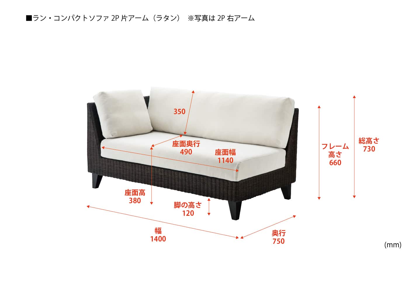 幅1400 / 奥行750 / 高さ730 / 座面高380 / 座奥行490