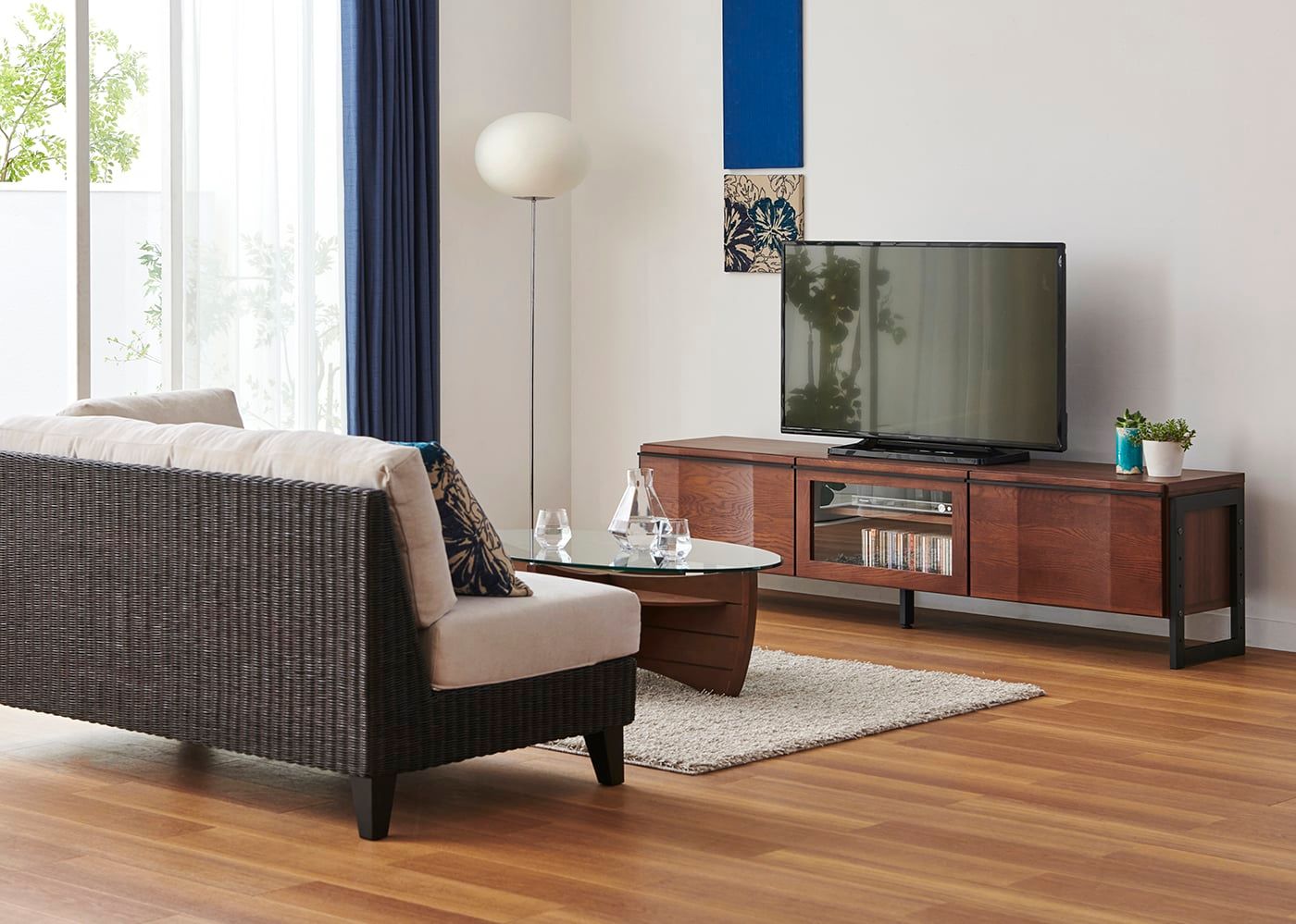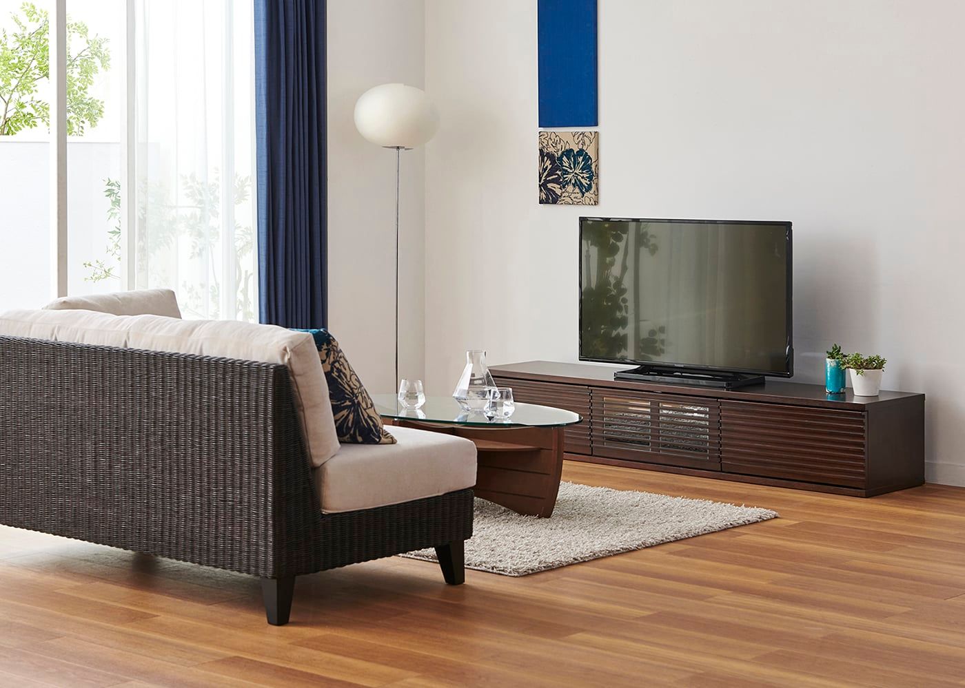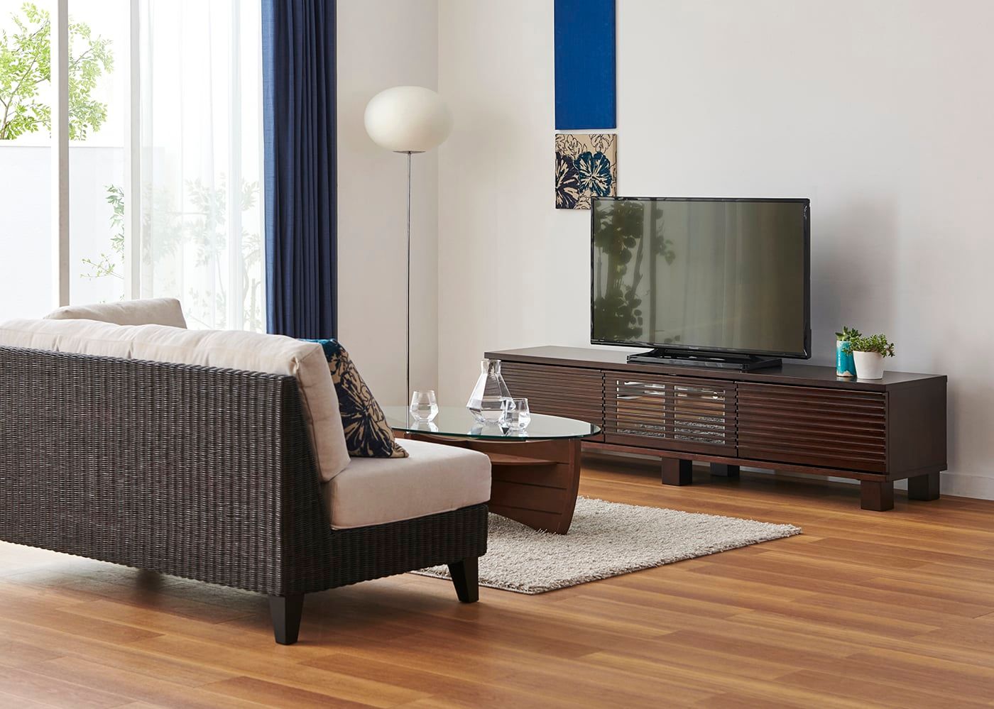 テレビボードは1540タイプ・フレームデザイン、ソファは幅1850mmの2.5人掛け