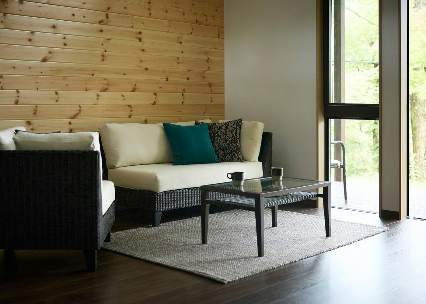 軽井沢に佇むログハウスの別荘で、自然と一体になるような暮らしを実現しました。ウッド調の内装や建具、暖炉のダークカラーに映えるシックな家具でコーディネート。広い窓に映し出される、グリーンの自然と調和する色や柄のインテリアも取り入れて、借景との一体感を演出しました。
