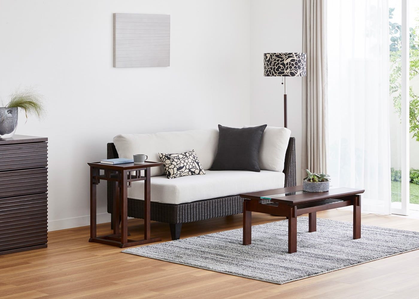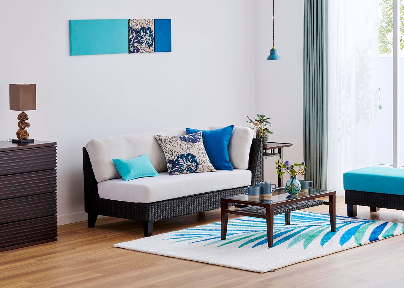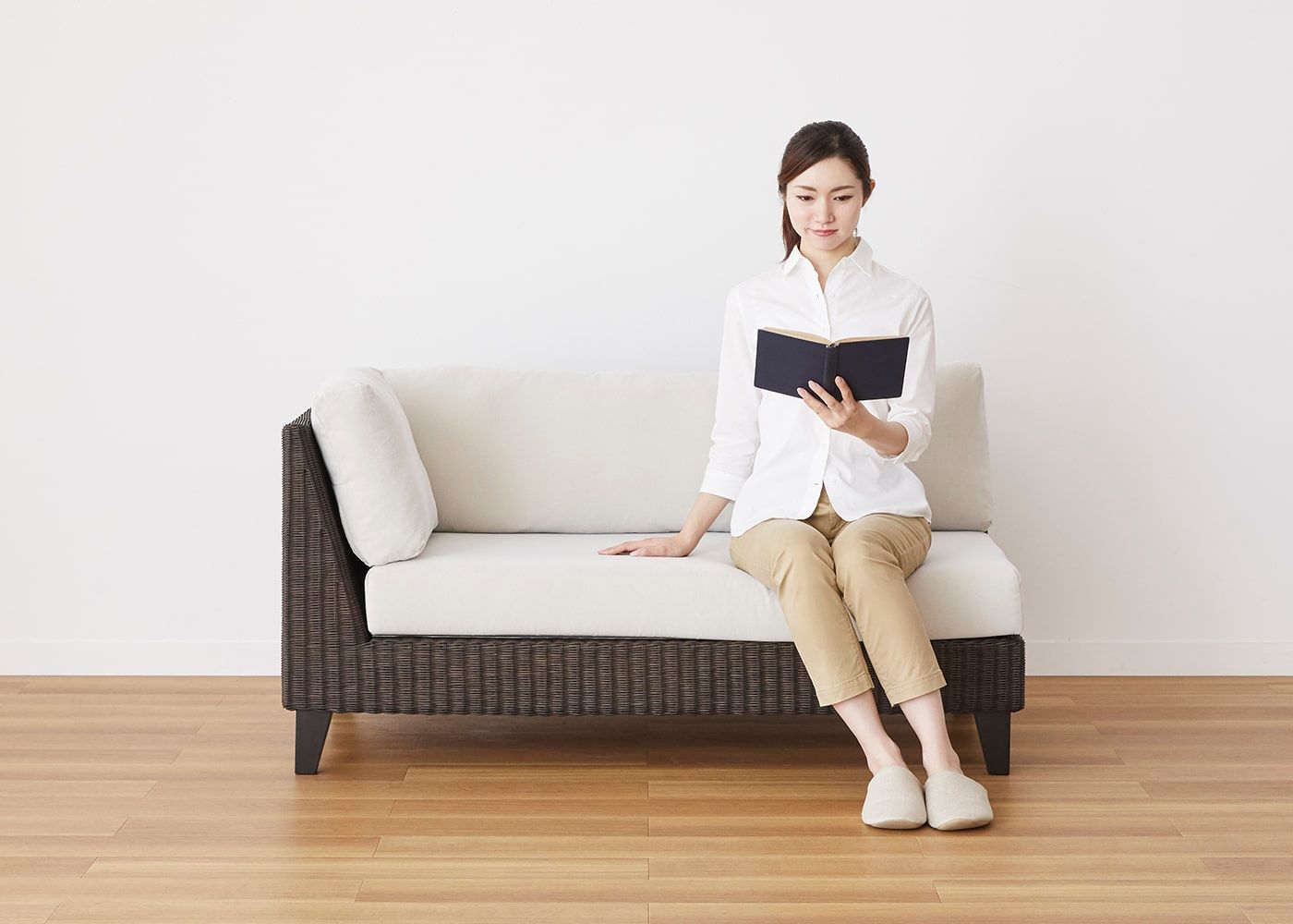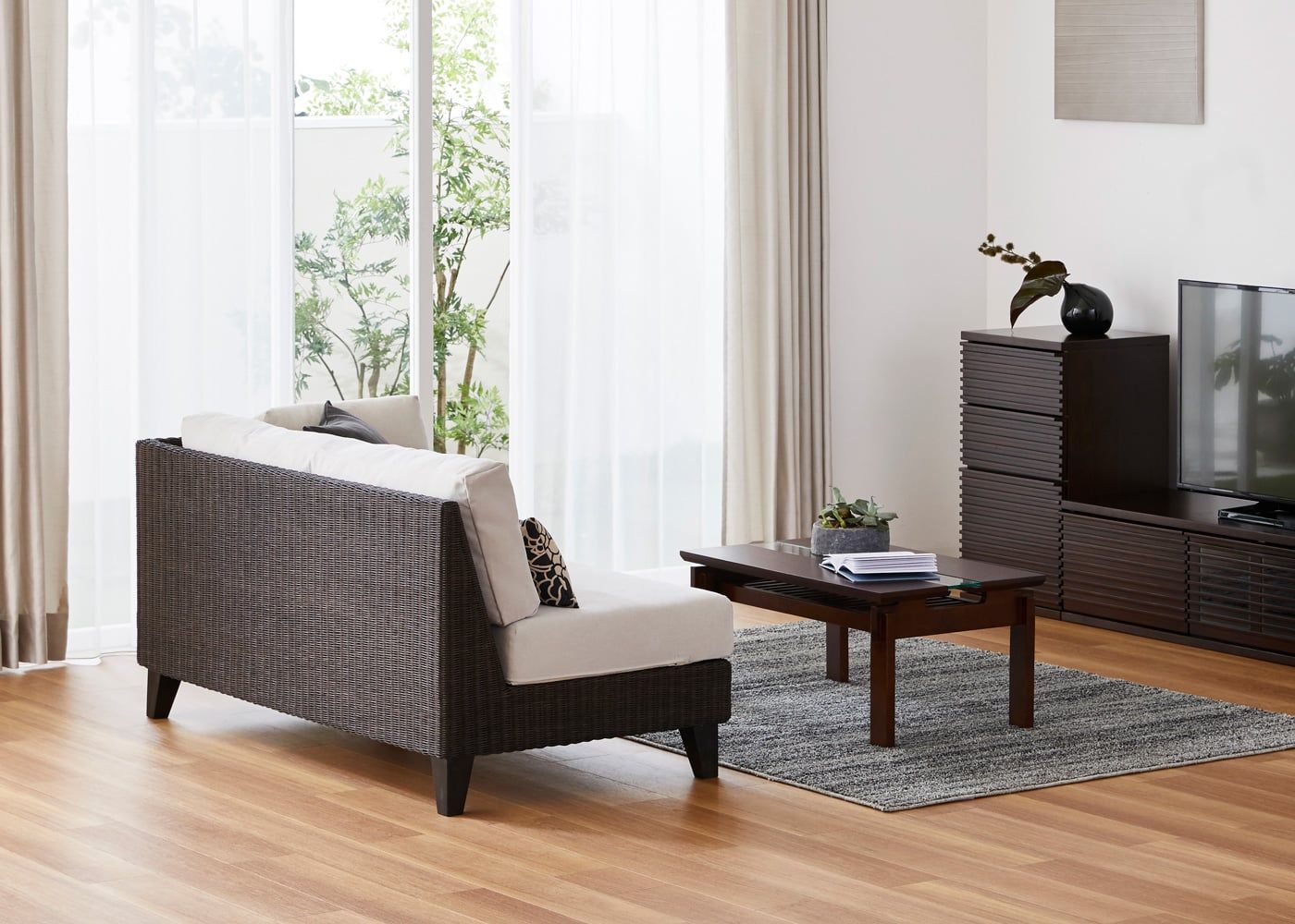 ソファをリビングルームに空間置きしても、片側がアームレスのため抜け感が生まれて、開放感のある部屋を作れます。また、綺麗に編み込まれた天然のラタン素材が映えます。