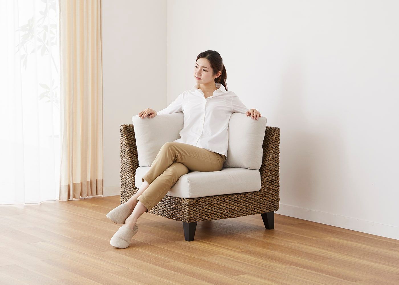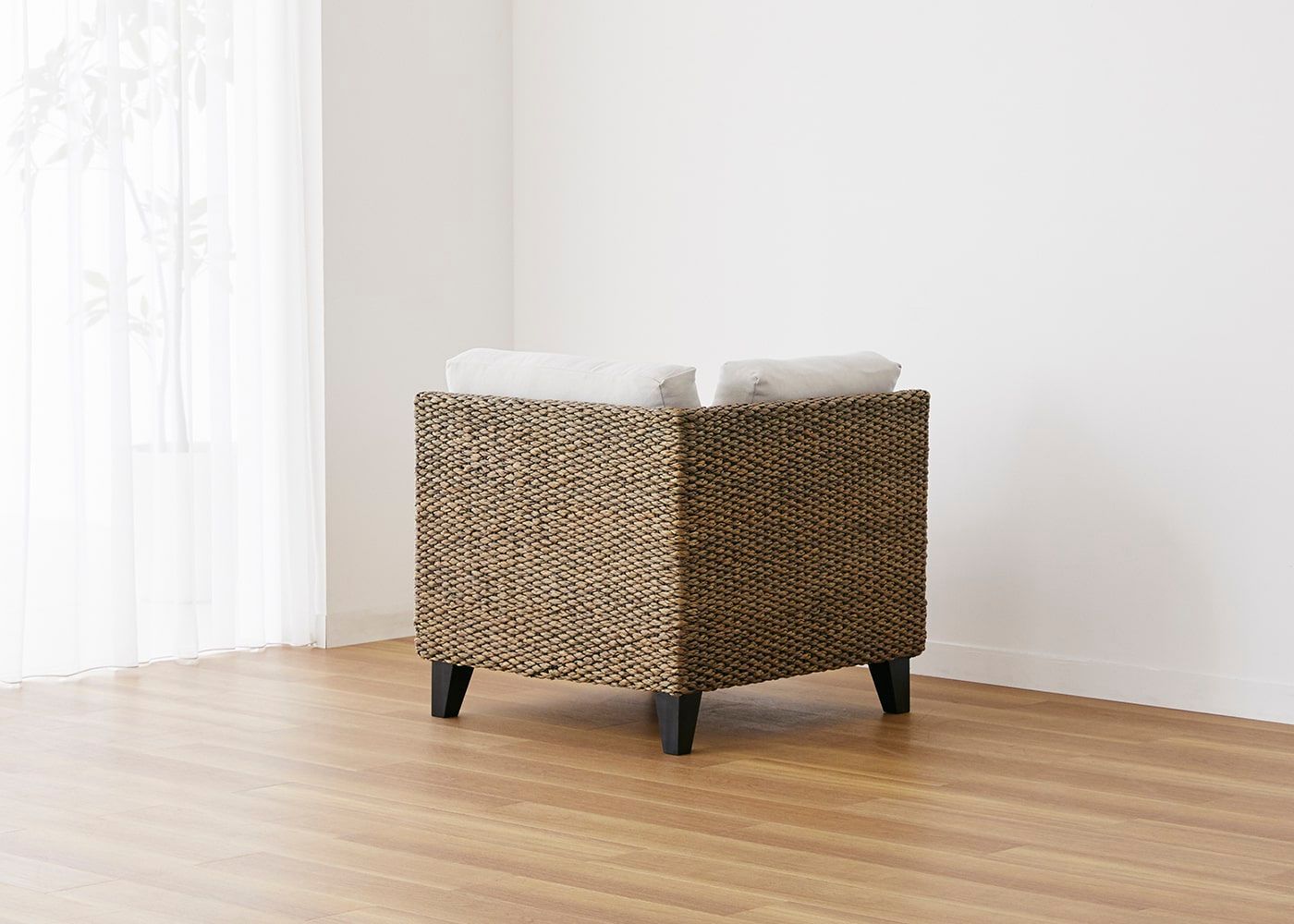 前面はもちろんのこと、背面やアーム側面などソファフレーム全体に編み込まれたヒヤシンス。丁寧に編み込まれた素材感や、光の当たり方による陰影などを視覚的に楽しむことができます。