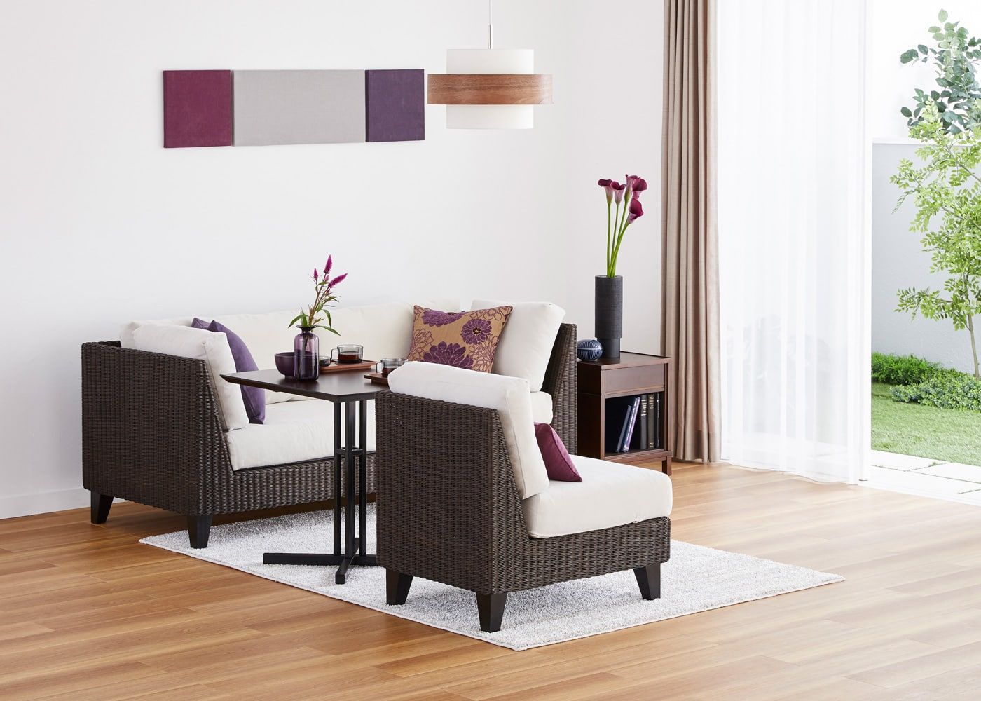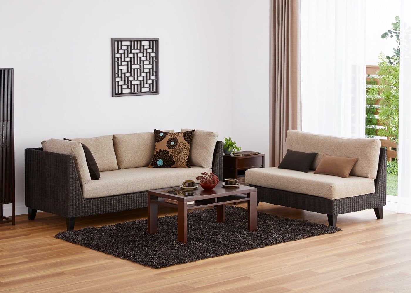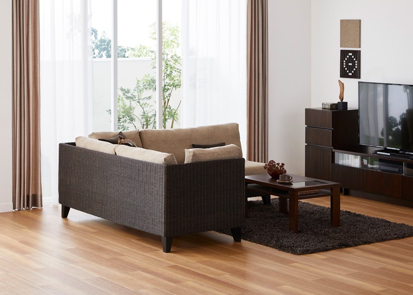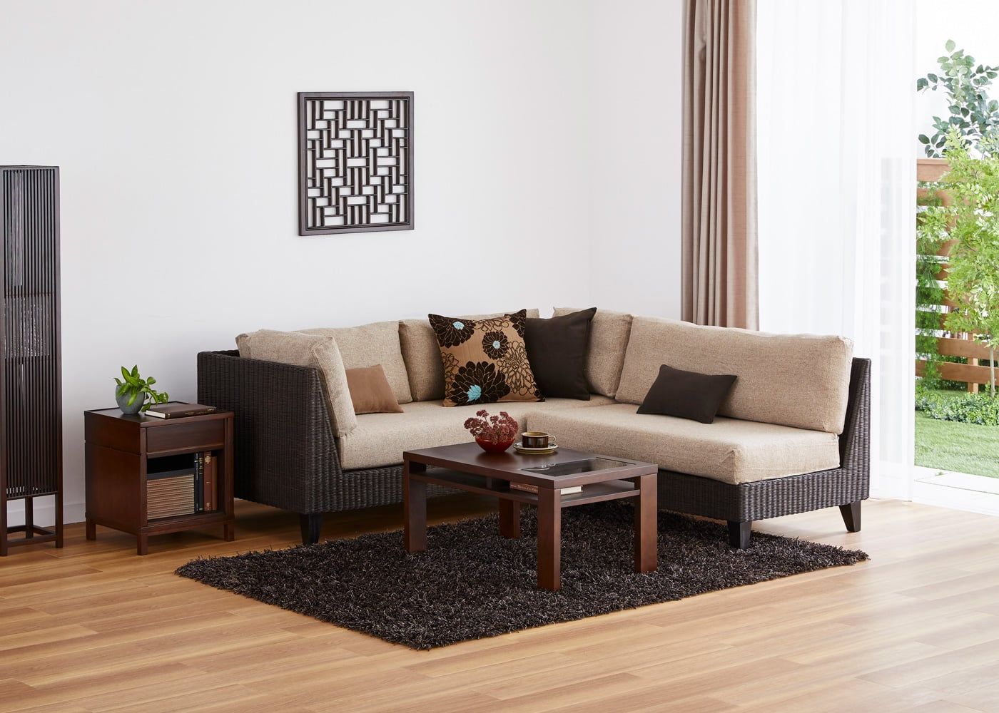 ゲストが来た時は1Pベンチをセパレートして、ほどよい距離感の中でゆったりと過ごすことも可能です。また、全体をアースカラーででコーディネートすれば、落ち着きのあるナチュラルな空間に仕上がります。(写真はコーナーソファセット 1Pベンチ)