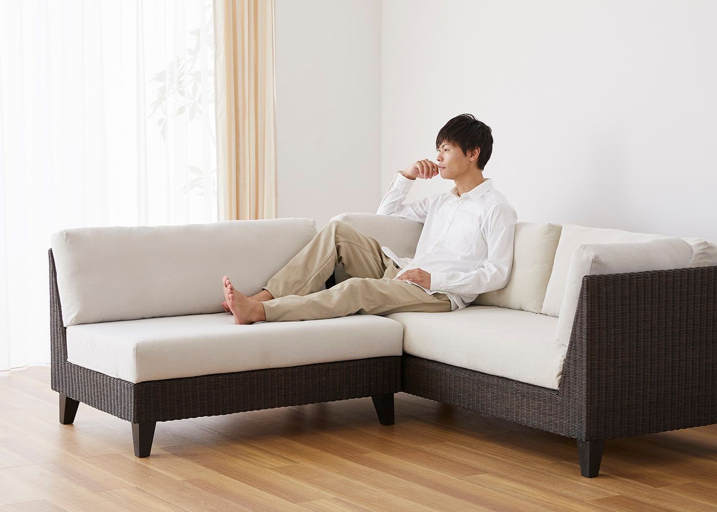 広い座面の上で脚を崩してゆったり座ることができます。肘が置きやすい背もたれ高さも楽な姿勢で座れるポイントです。(写真はコーナーソファセット 2Pベンチ。モデルは身長172cmの男性)