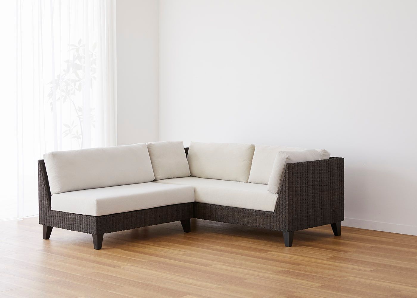 ベンチパーツは左右どちら側にも取り付け可能で、L字の向きを変更できます。屋外の景色を楽しみたい場合は、外側に向けたレイアウトもおすすめです。(写真はコーナーソファセット 2Pベンチと