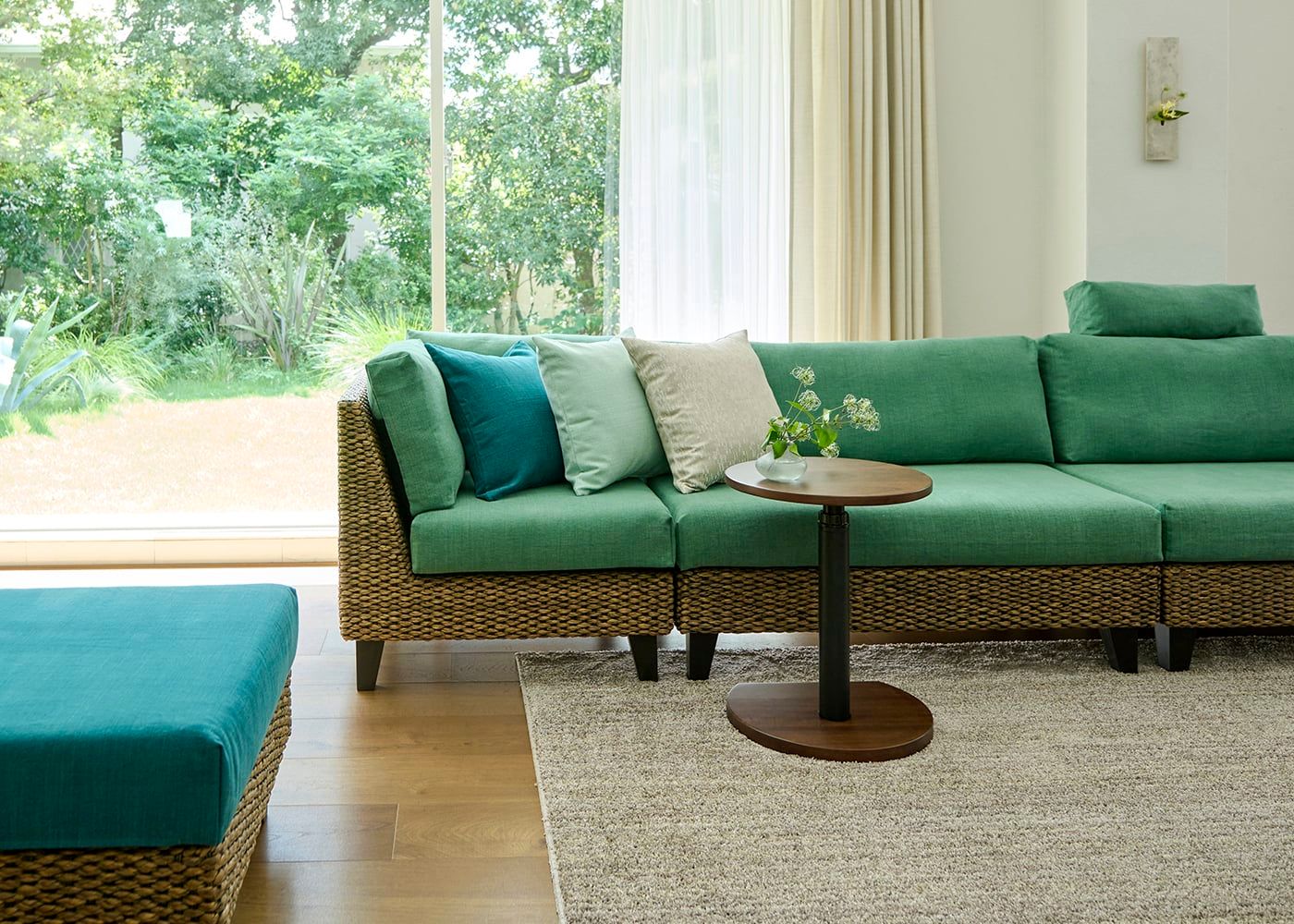 リビングにガーデンの息吹を感じさせるようなソファをセレクト。フォレストグリーンからミントグリーンまで、瑞々しい青緑のグラデーションをクッションとソファカバーで表現しました。ベージュのラグやカーテンが緑を一層引き立て、自然と調和する空間が叶います。