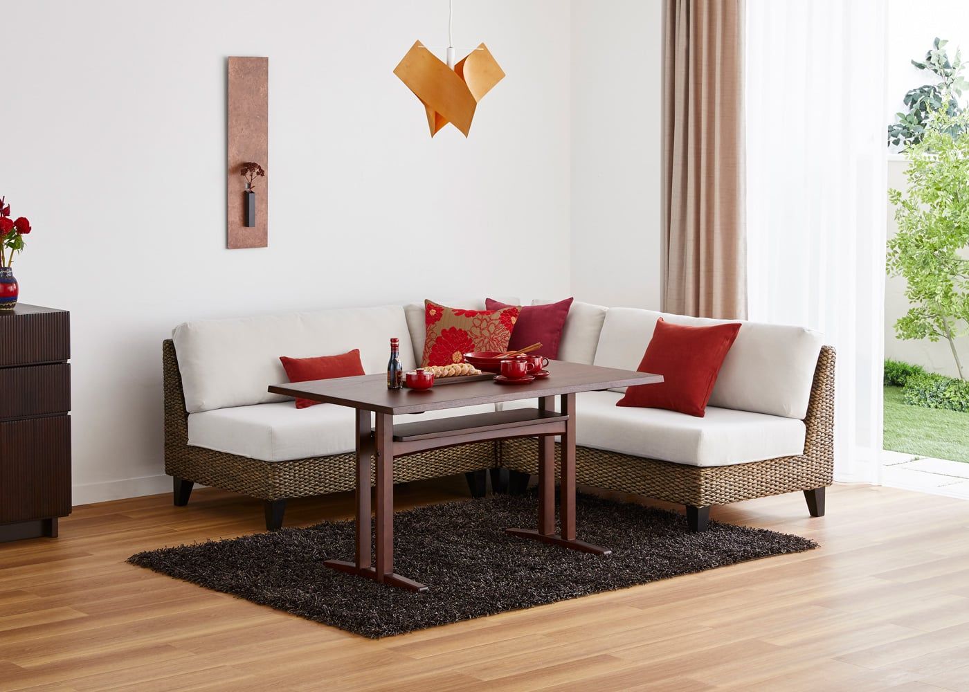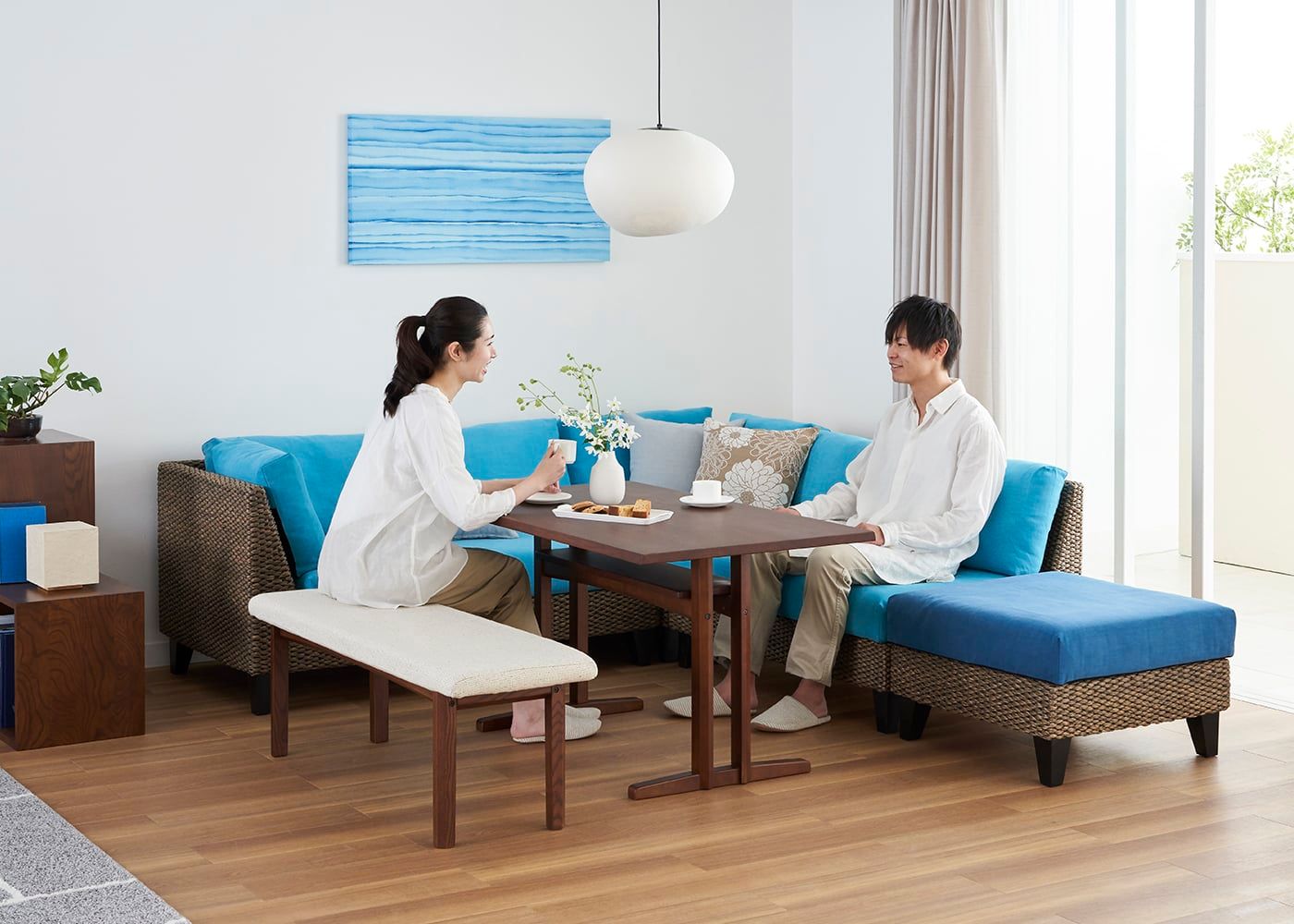 ローテーブルが配置しやすくなります。ライフスタイルが変わったり、模様替えの際にレイアウトを変えてみましょう。(写真はコーナーソファセット 2Pベンチ+1Pベンチ)