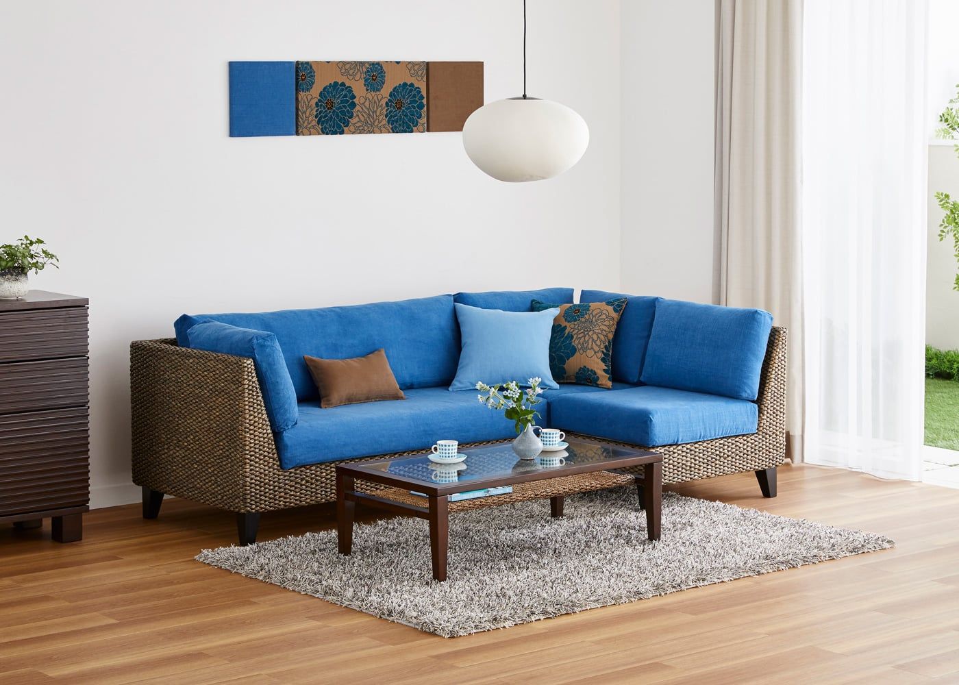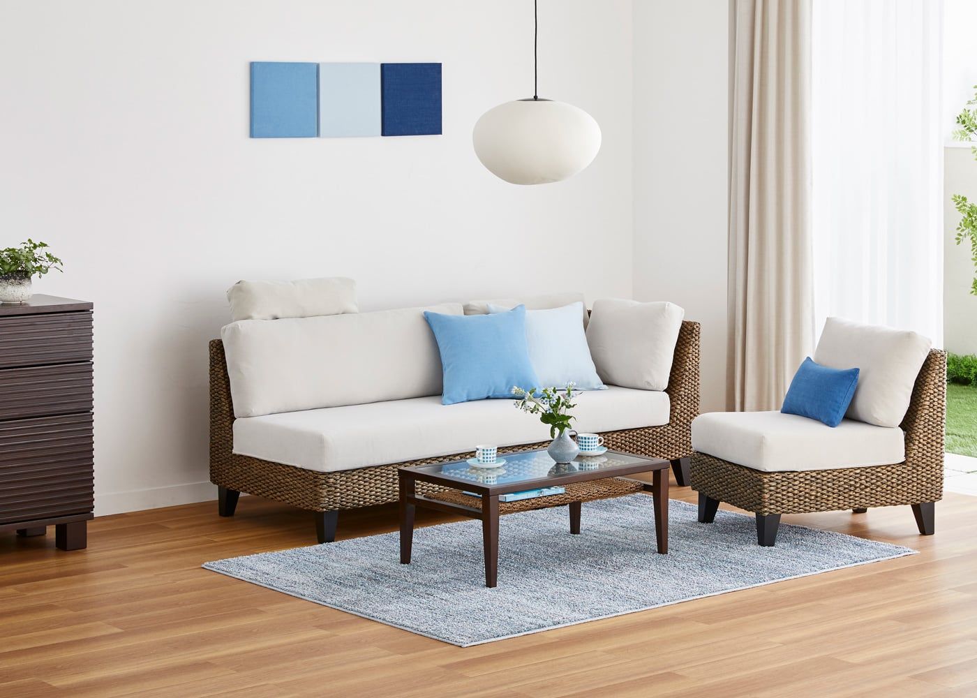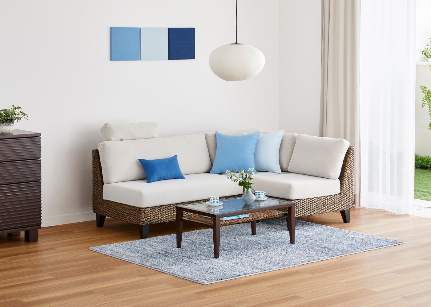 シーサイドブルー・スタイル」でコーディネートしてみましょう。(写真はコーナーソファセット 2P右アーム+1Pベンチ、ソファカバーは