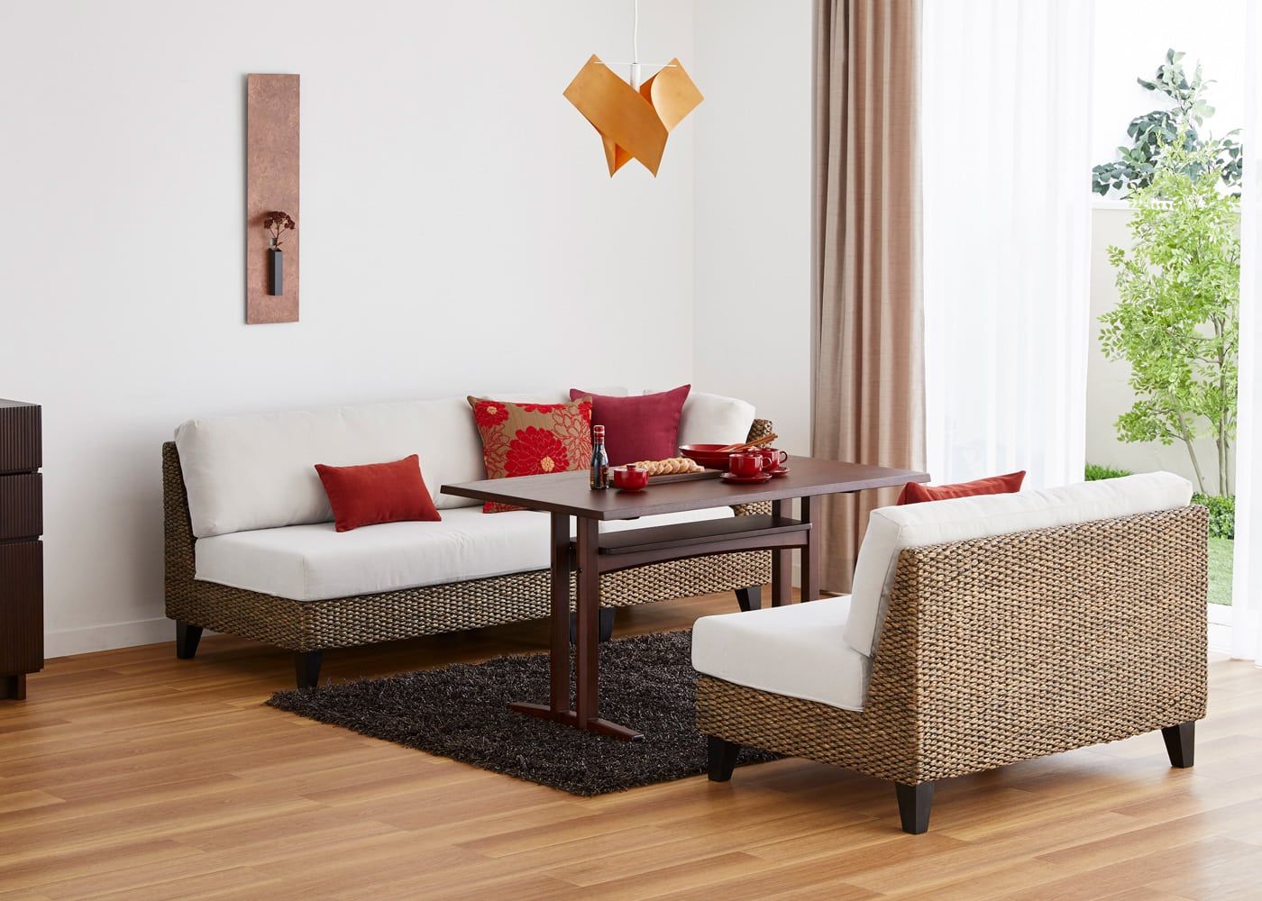 家族全員が心地よく過ごせるソファダイニングは、大人から子供までのリラックスタイムに最適です。食事の時間も、くつろぎの時間も、このソファがあればマルチに使えます。天然素材を用いたソファとテーブルに、癒しのグリーンインテリアを組み合わせました。