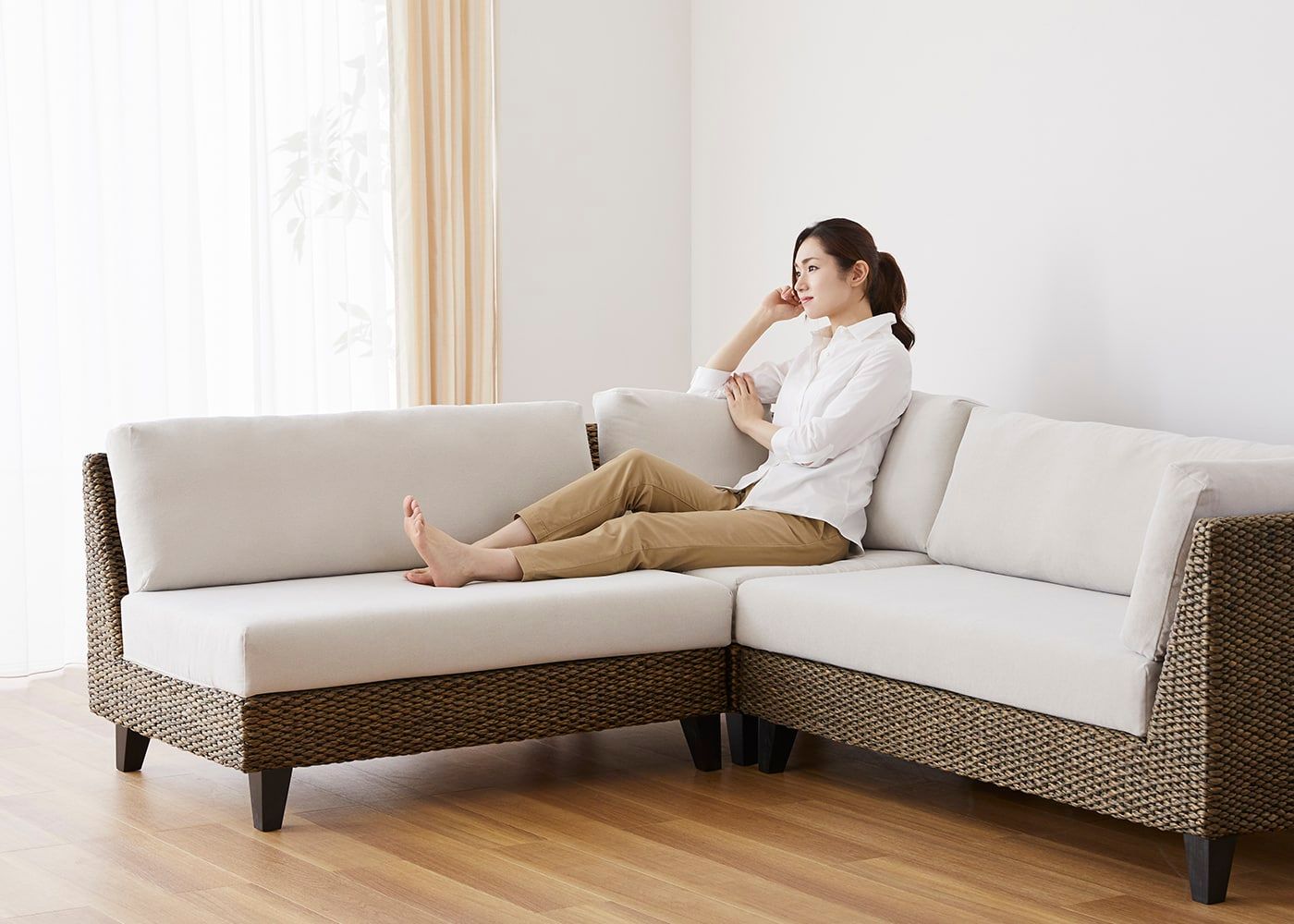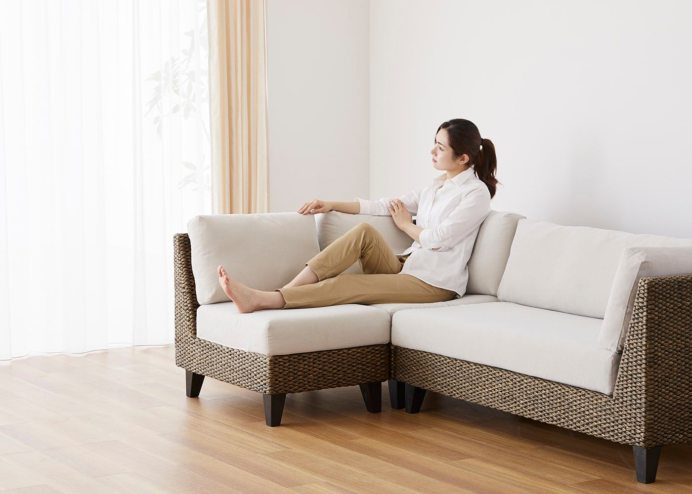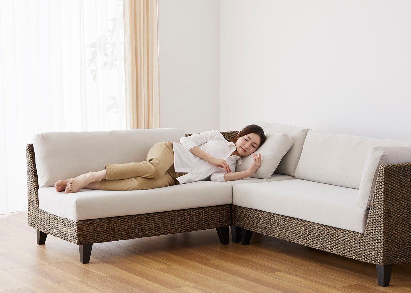 サイドクッションを枕にして、横になることもできます。日中のちょっとした休憩や昼寝にも最適で、心地よいひとときを提供します。(写真はコーナーソファセット 2P左アーム+2Pベンチ。モデルは身長167cmの女性)