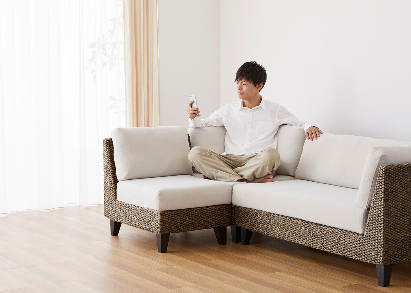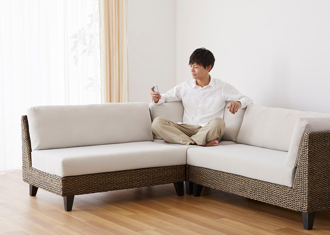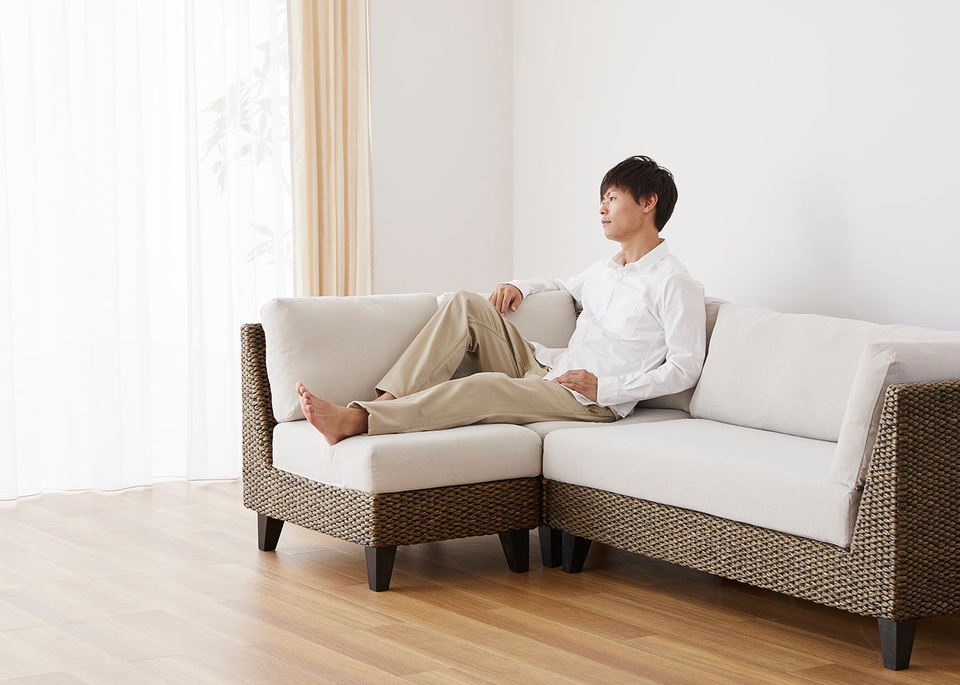 男性が胡坐をかいて座ることができるのもコーナーセットの特長です。左右から支えるクッションが身体にフィットし、自由な姿勢でリラックスできる快適さを提供します。(写真はコーナーソファセット 2P左アーム+1Pベンチ。モデルは身長172cmの男性)