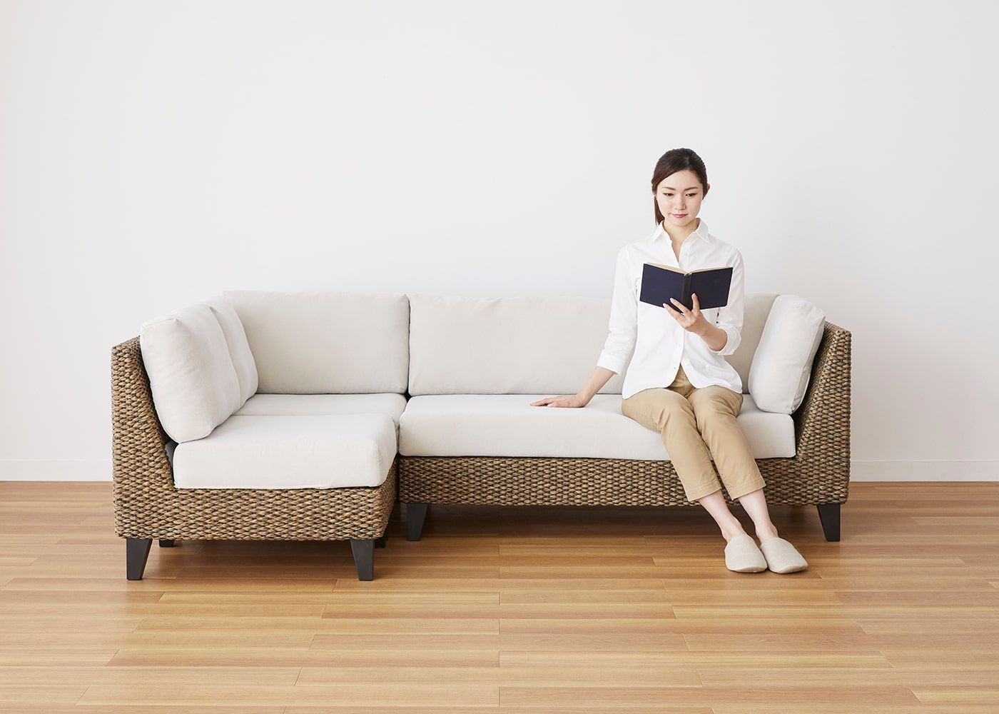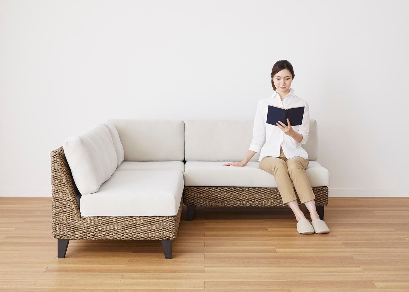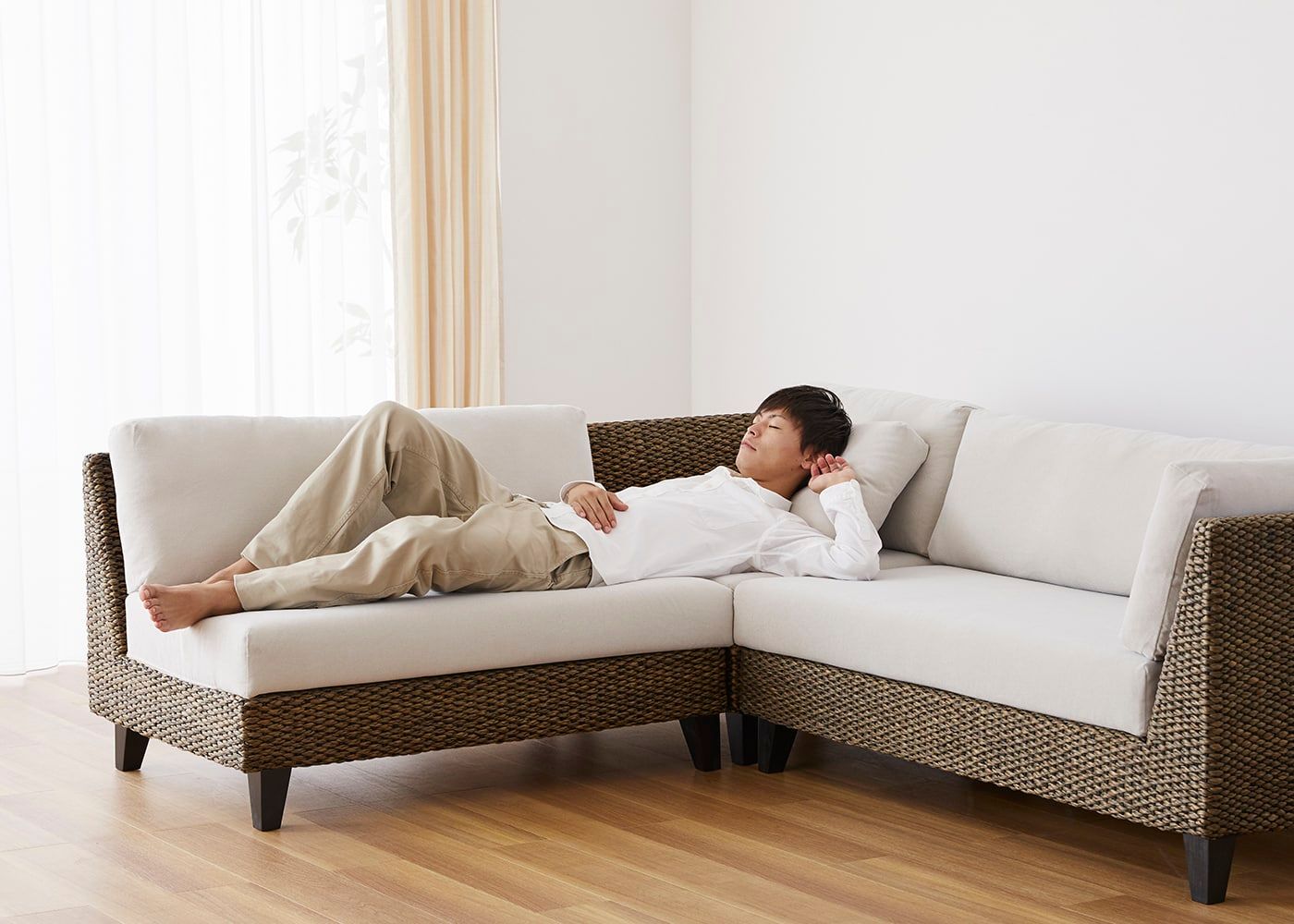 「ソファでちょっとお昼寝」ができるのが魅力です。さらにバッククッションを外すと座面が広くなり、よりゆったりとしたスペースで寛げます。(写真はコーナーソファセット 2P左アーム+2Pベンチ。モデルは身長172cmの男性)
