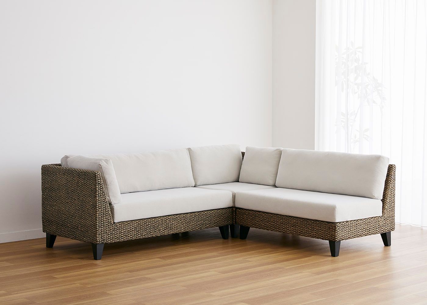 「ゆとりある生活動線の実現」と「様々な座りかたで寛げる」を追求したラン・コンパクトソファのv05 コーナーセット。傾斜のあるアームやサイドクッションで、快適なくつろぎ空間を提供します。(写真はコーナーソファセット 2P右アーム+2Pベンチ)