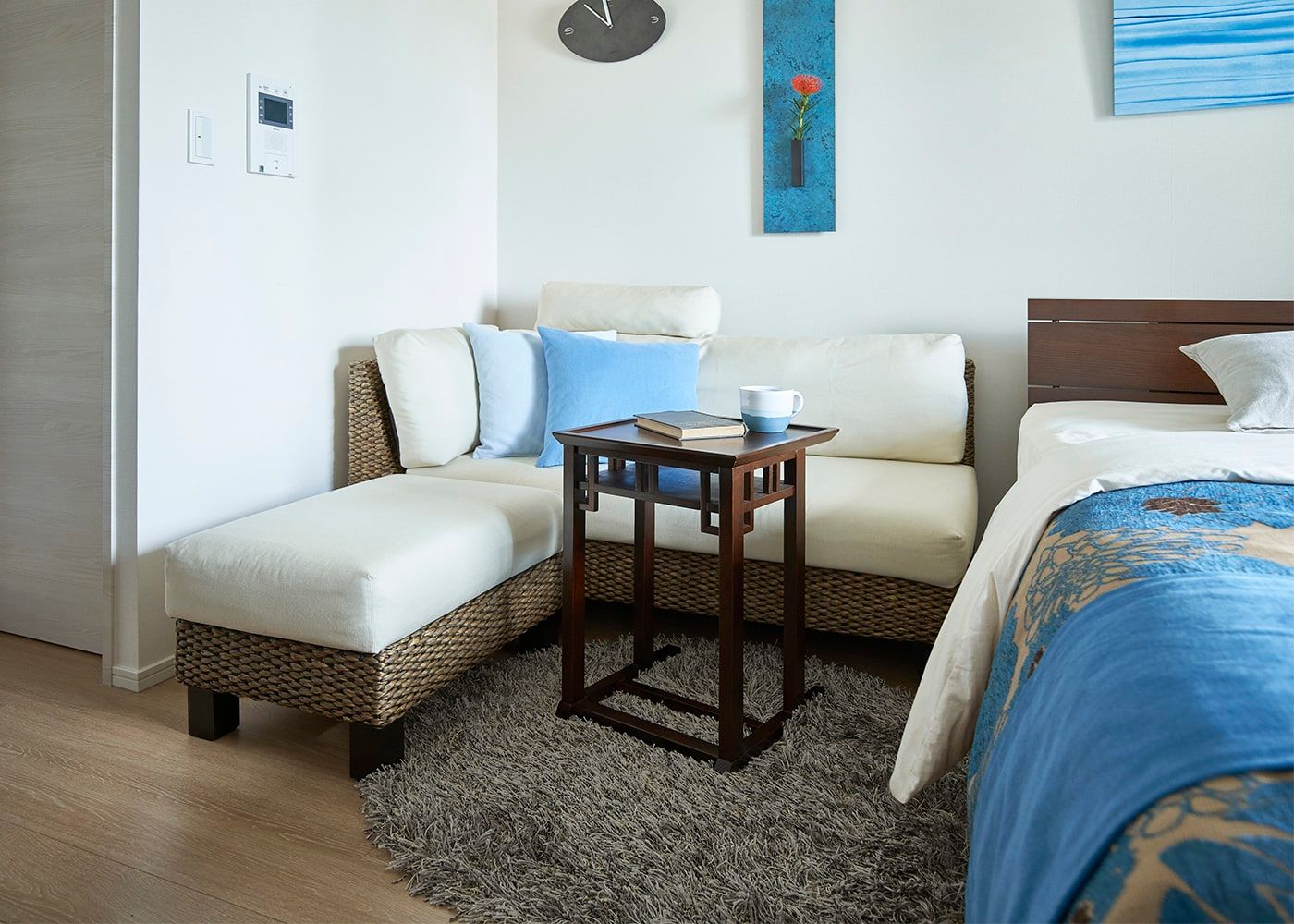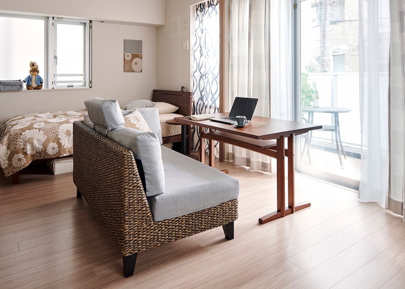 ワンルームの限られた空間をホテルライクに仕上げた実例です。リゾートの雰囲気を演出しやすいヒヤシンス素材を使用したソファを採用して、ホテルライクな空間に。コンパクト設計のためワンルームでも配置しやすく、くつろぎ方のバリエーションを増やしてくれます。