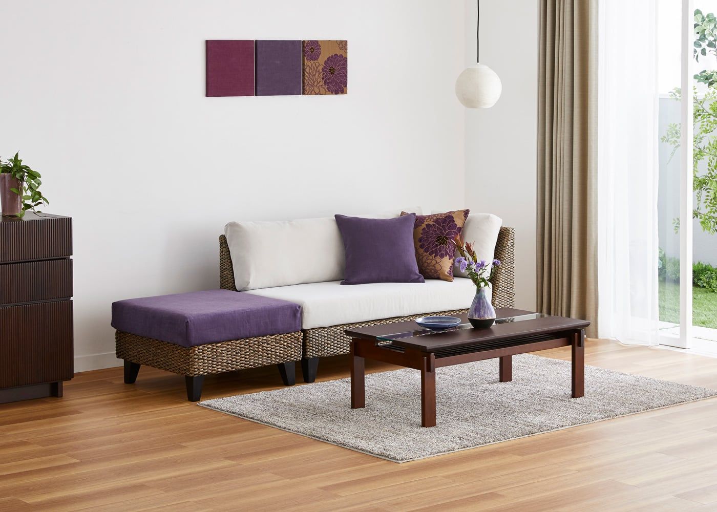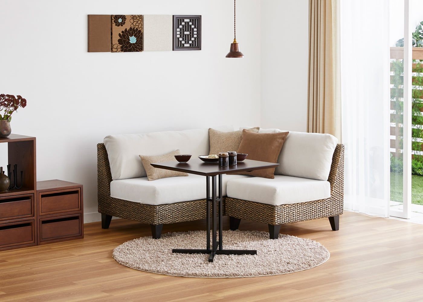 ライフスタイルの変化で二人暮らしになった際、1Pベンチを2P片アームの隣に移動し、カフェテーブルを追加すると、ゆったり過ごせるソファダイニング空間に変わります。(写真は左アームと