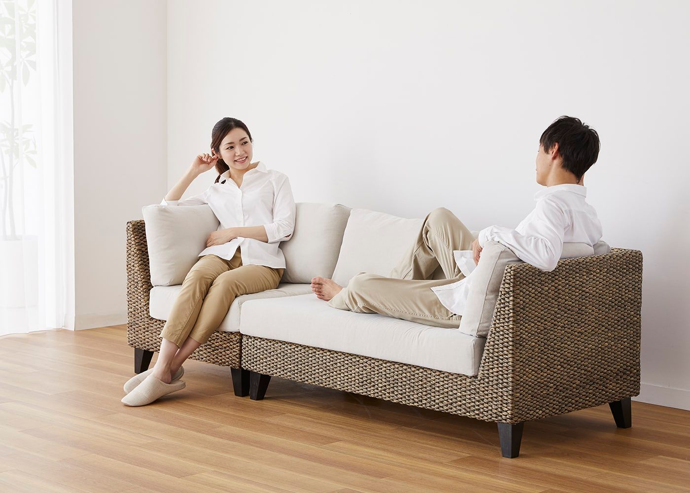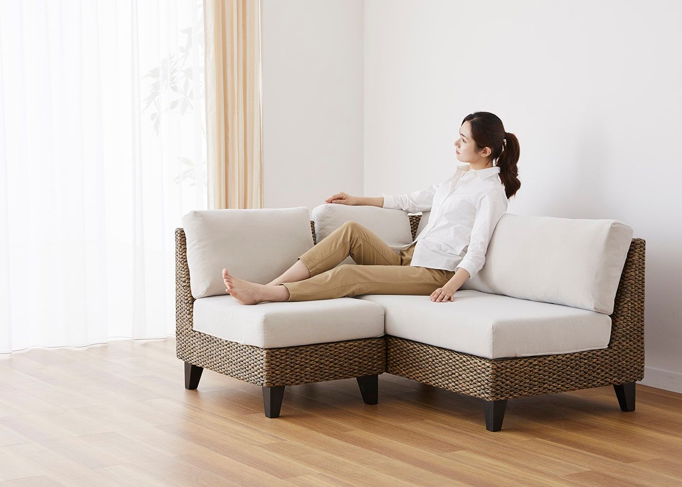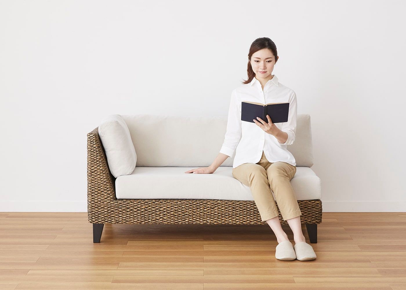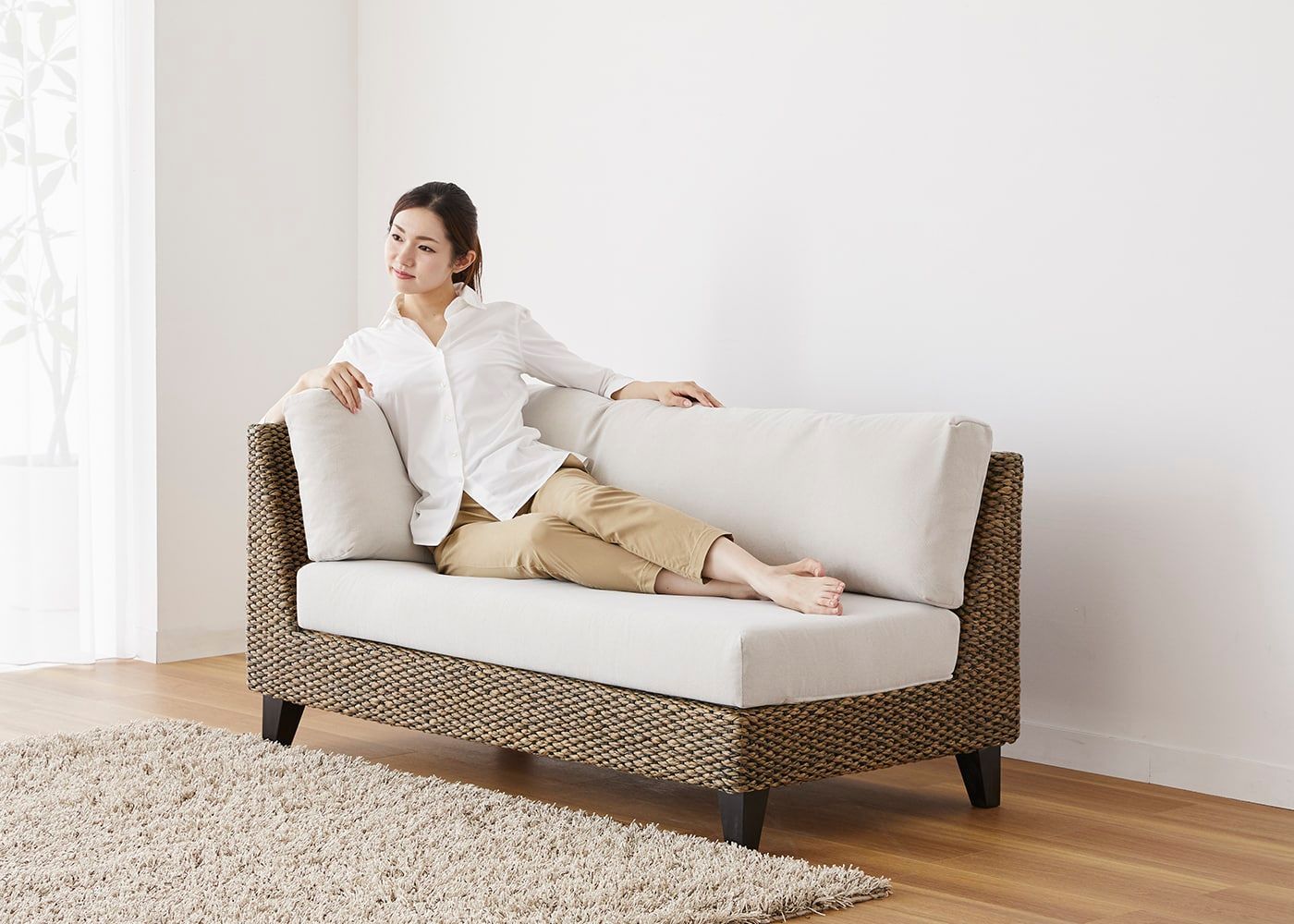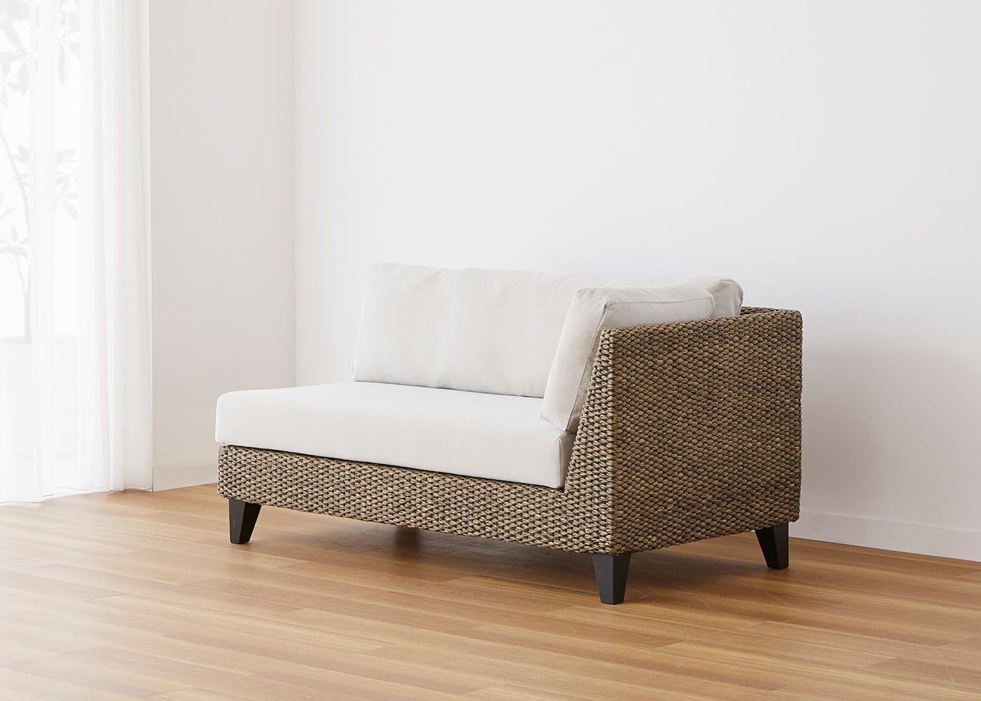 ソファをリビングルームに空間置きしても、片側がアームレスのため抜け感が生まれて、開放感のある部屋を作れます。また、綺麗に編み込まれた天然のヒヤシンス素材が映えます。