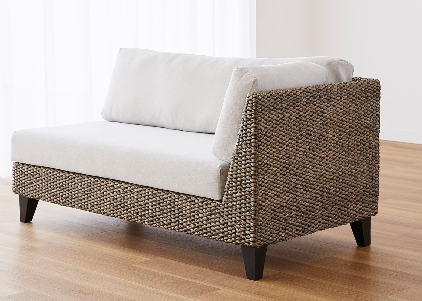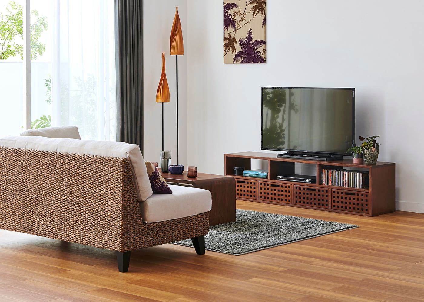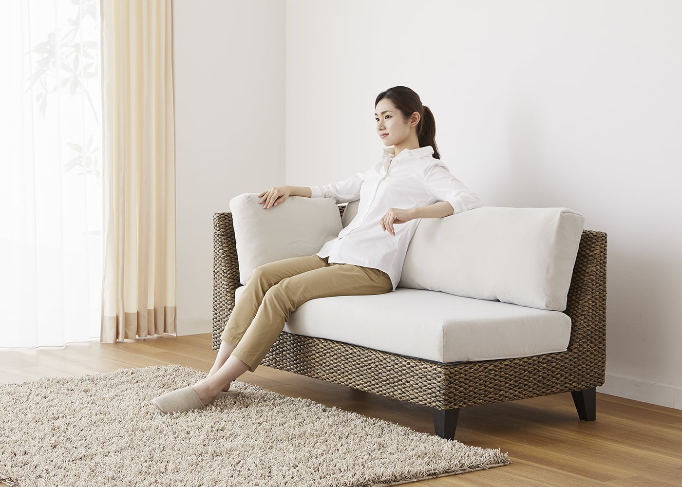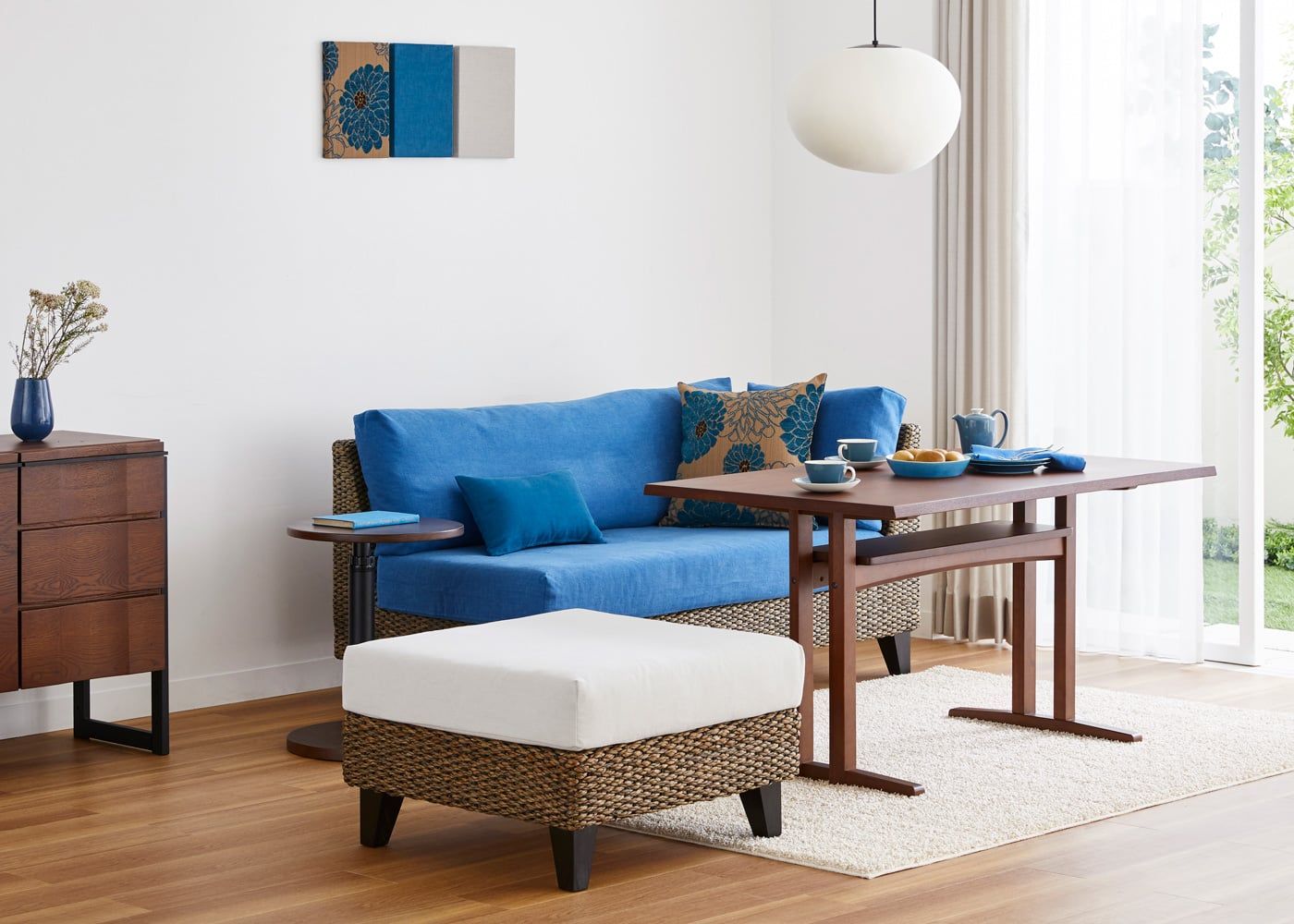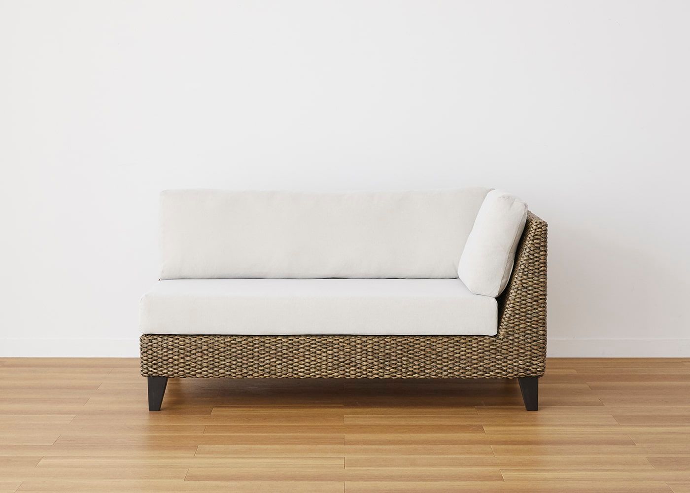 ソファをリビングルームに空間置きしても、片側がアームレスのため抜け感が生まれて、開放感のある部屋を作れます。また、綺麗に編み込まれた天然のヒヤシンス素材が映えます。