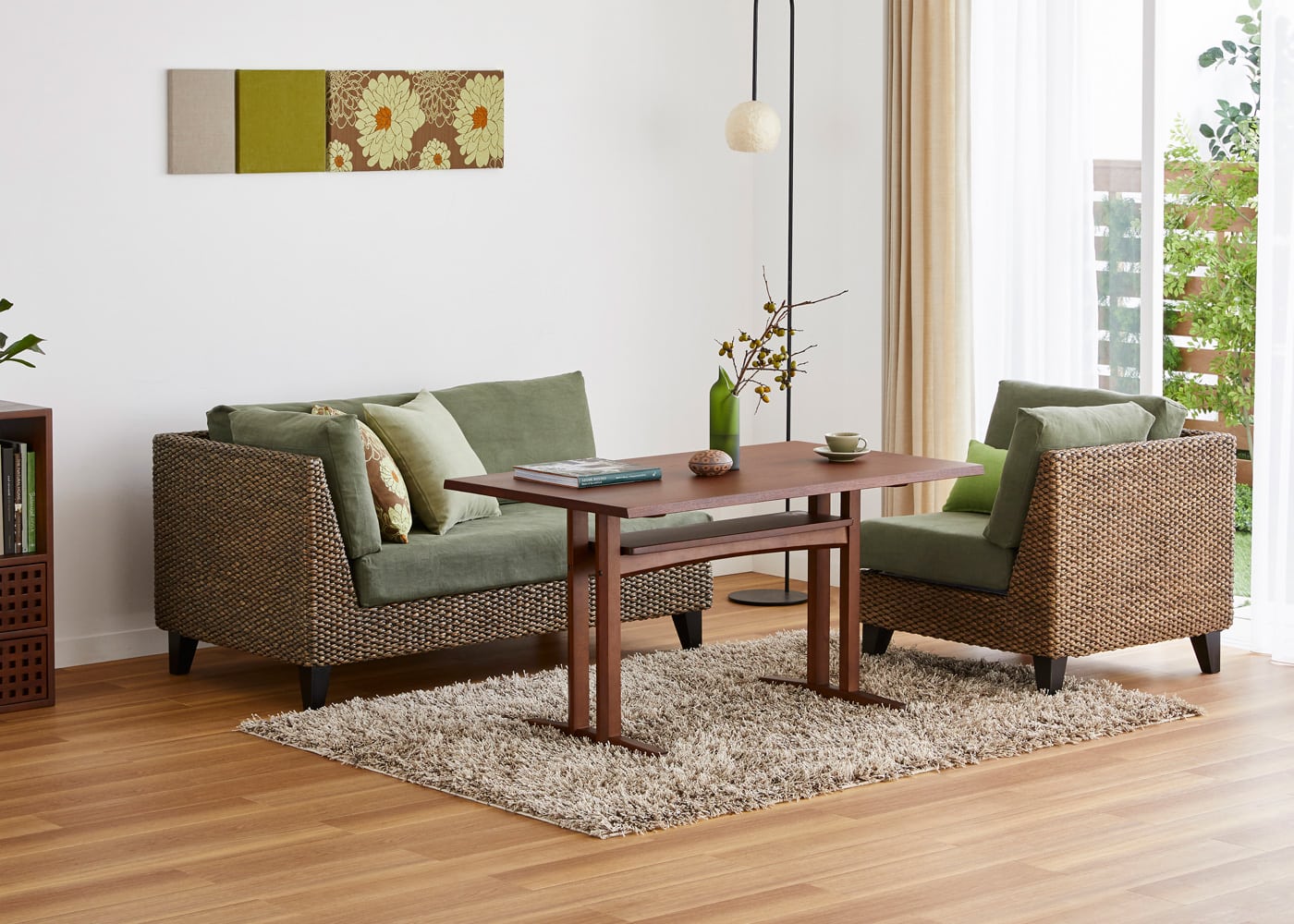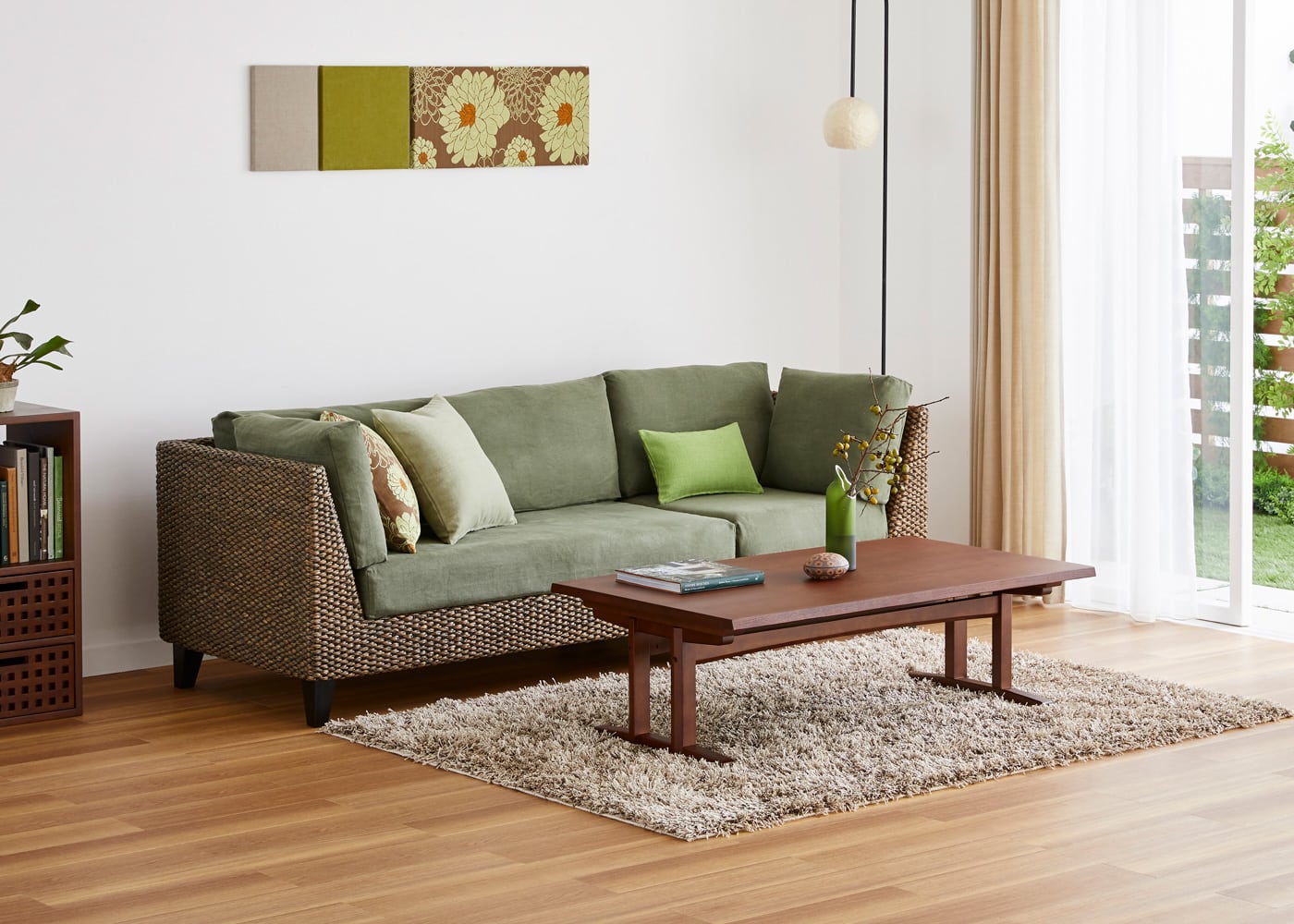 自然の温もりを感じる無垢材テーブルと、天然素材のヒヤシンスを使ったL字ソファに、様々な緑のクッションを合わせたリビング。穏やかな時間を過ごせる空間を演出しました。心地よいグリーンインテリアで、毎日を豊かに彩りましょう。