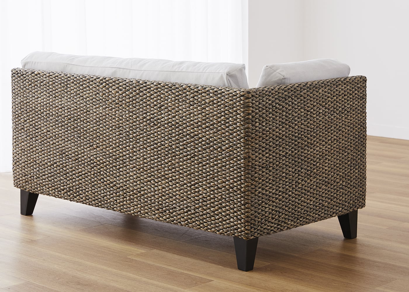 前面はもちろんのこと、背面やアーム側面などソファフレーム全体に編み込まれたヒヤシンス。丁寧に編み込まれた素材感や、光の当たり方による陰影などを視覚的に楽しむことができます。