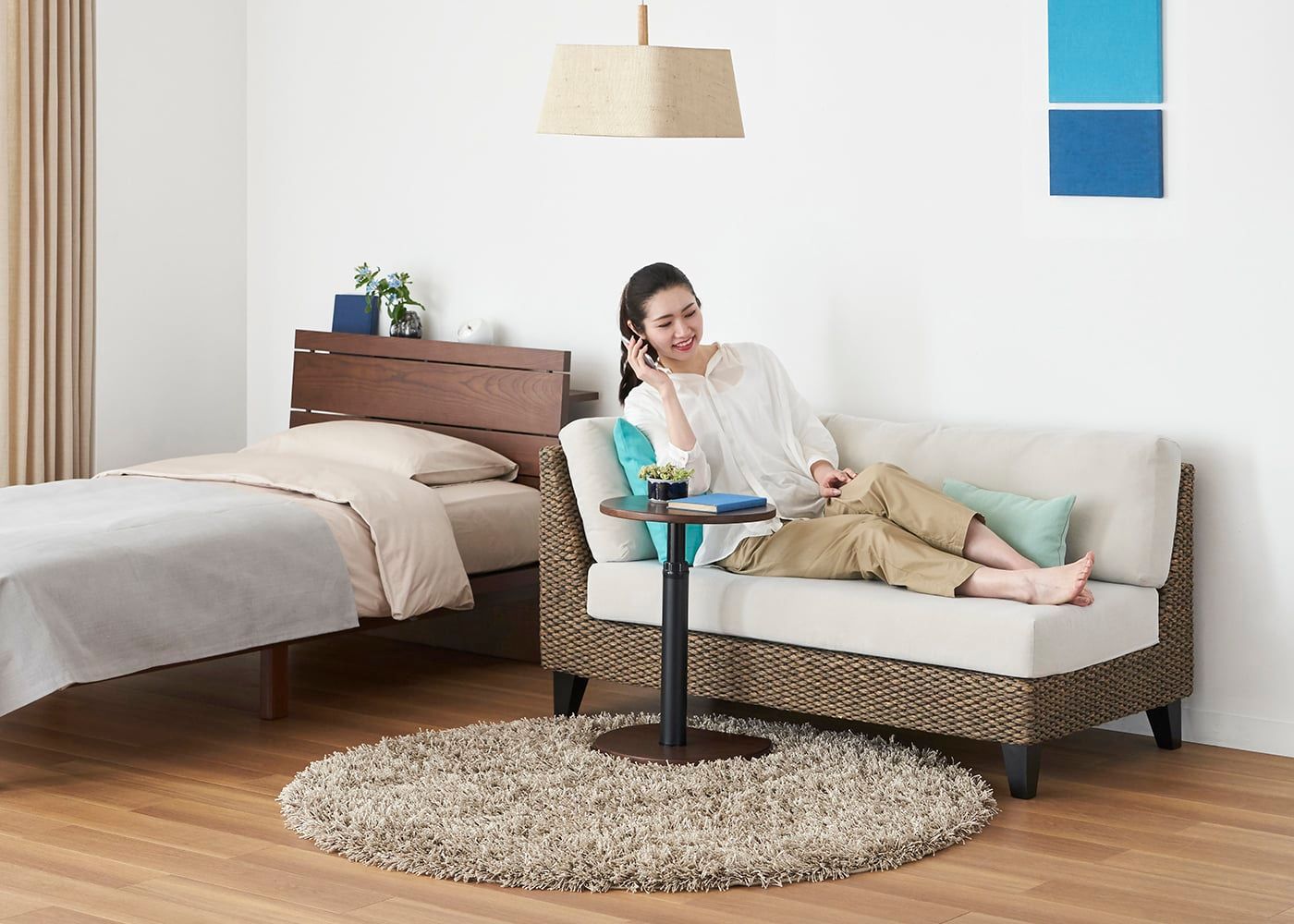 リラックスと食事の両方に最適な高さで、家族や友人とのコミュニケーションを豊かにします。多機能性を兼ね備えたこのスタイルは、生活空間を便利で心地よく演出します。(モデルは身長167cmの女性)