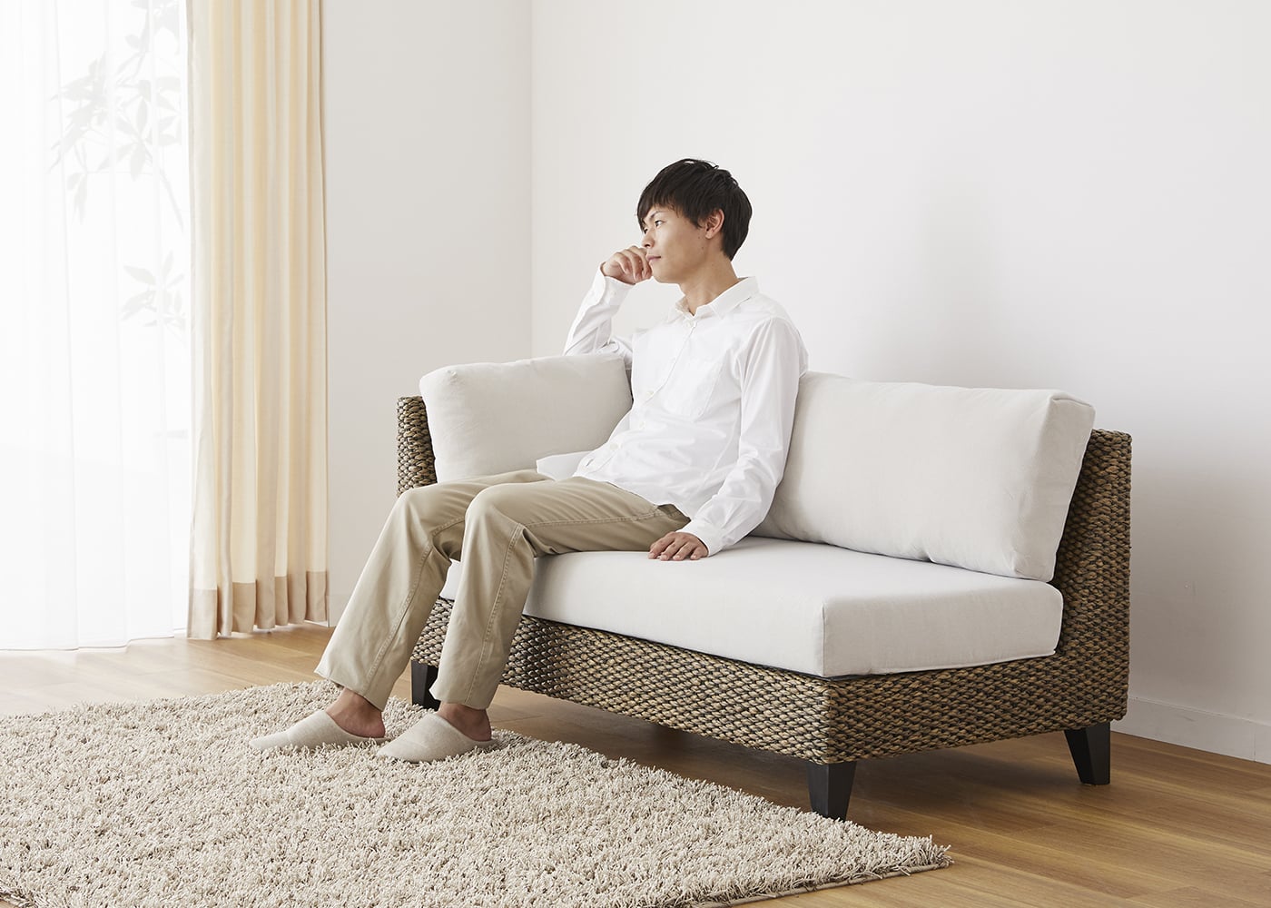 奥行き750mmのソファは、正しい姿勢で快適に身体を預けることができ、長時間座っていても疲れにくいです。座面の深さが絶妙で、リラックスしたひとときをサポートします。(モデルは身長172cmの男性)
