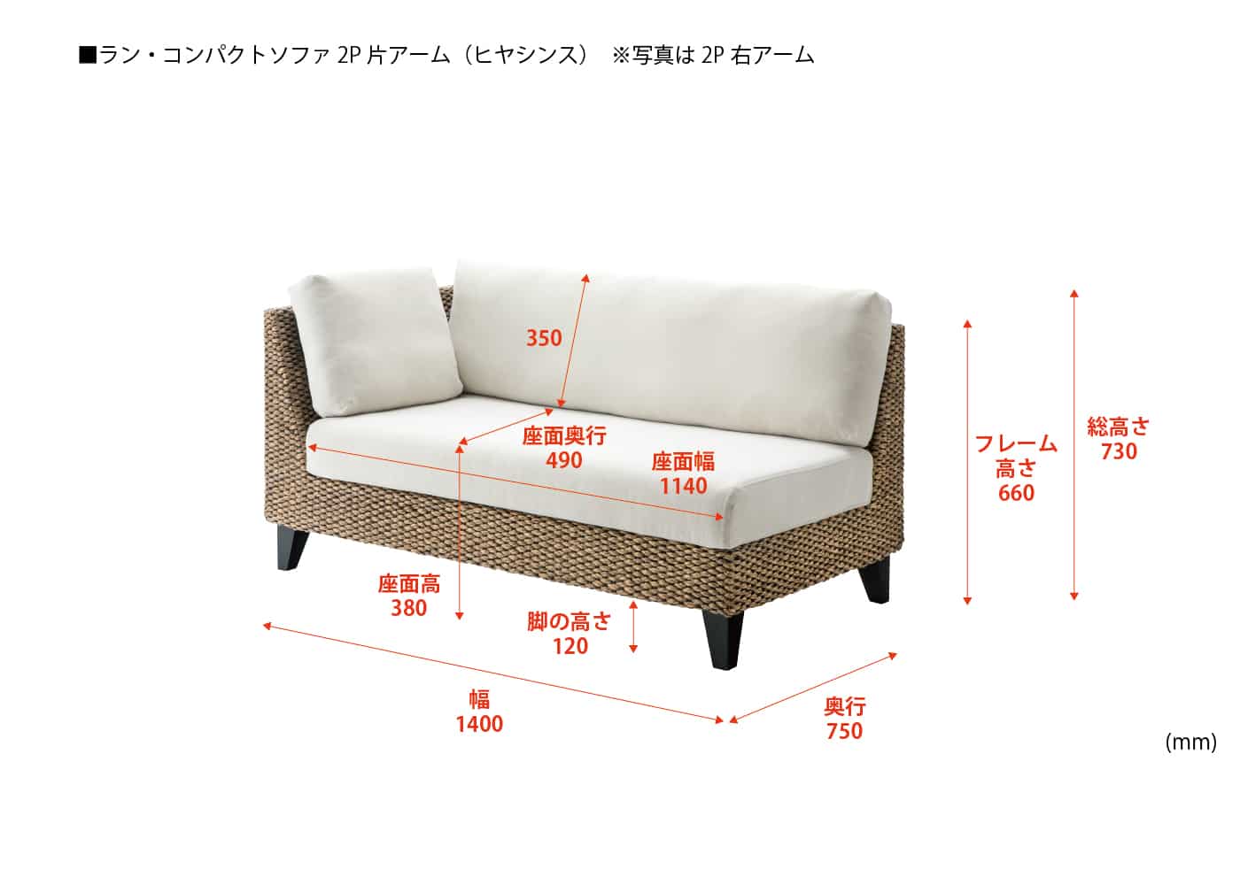 ラン・コンパクトソファ 2P片アームはコンパクトな奥行き750mmに設計。奥行きが小さくスペースを有効活用できるため、一人暮らしのワンルームなど限られた空間にも配置しやすいソファです。
