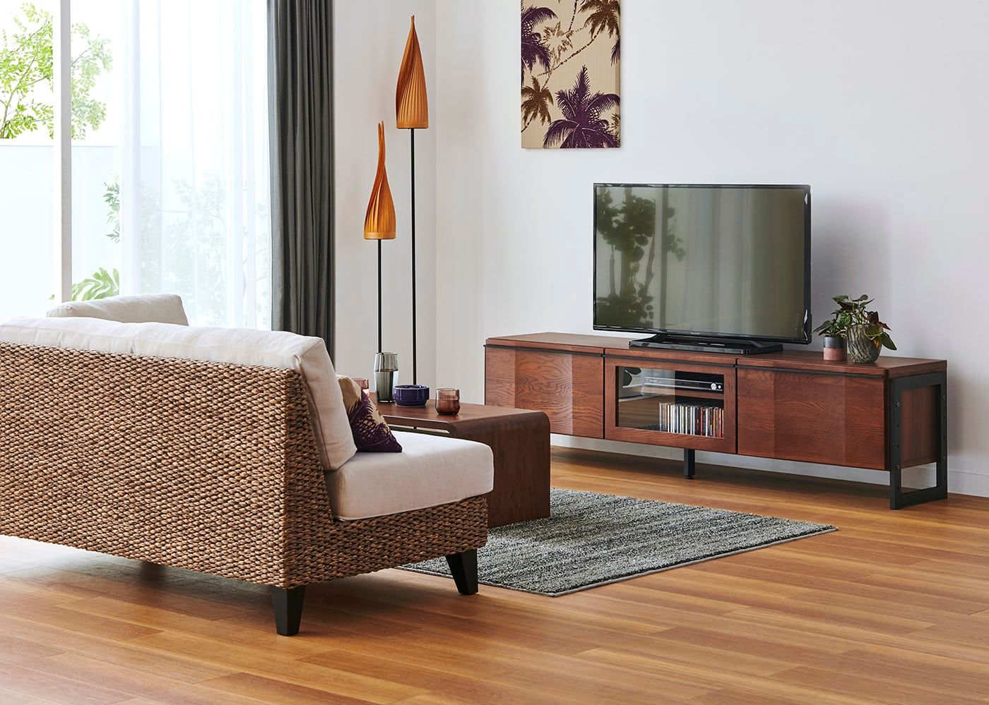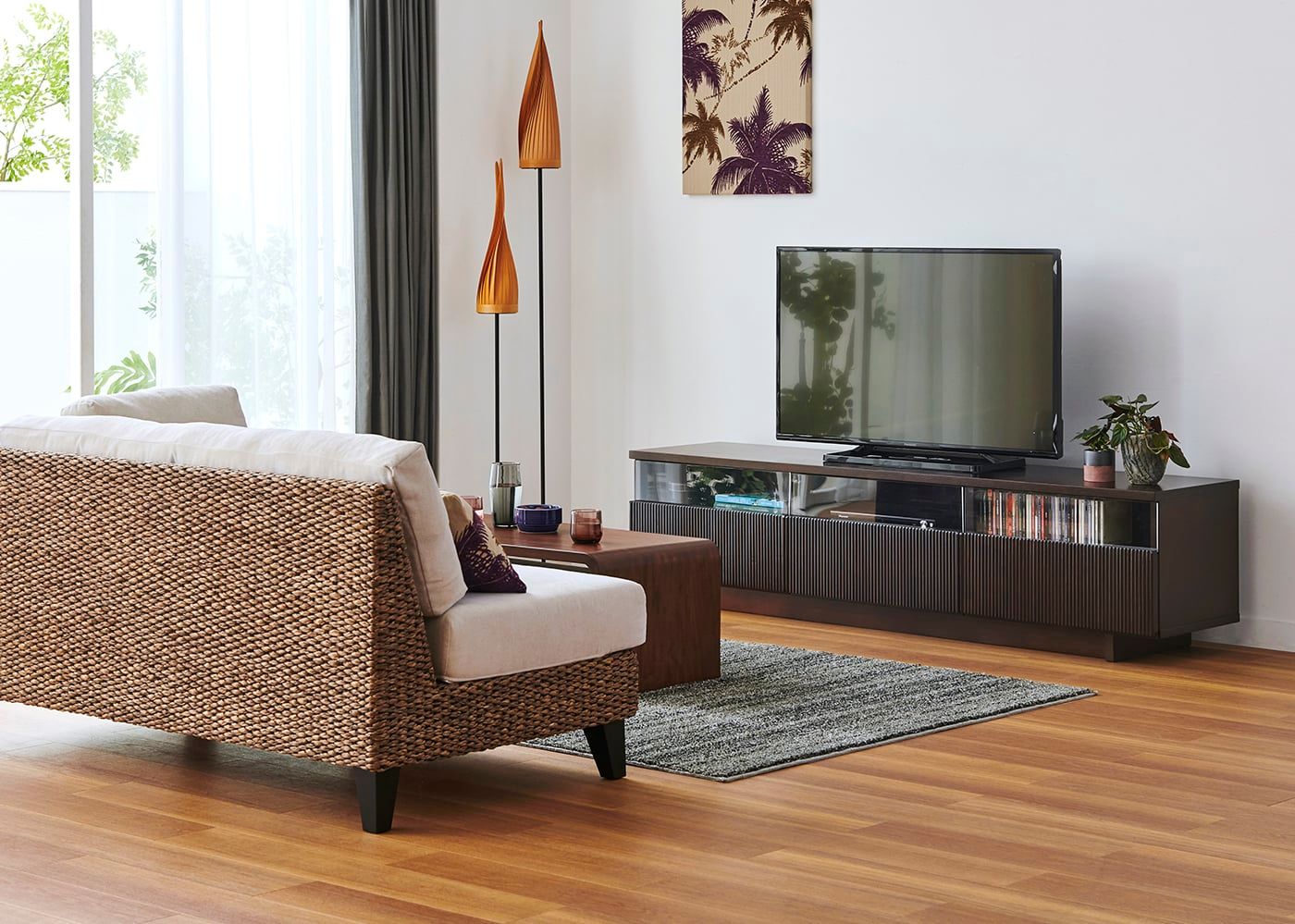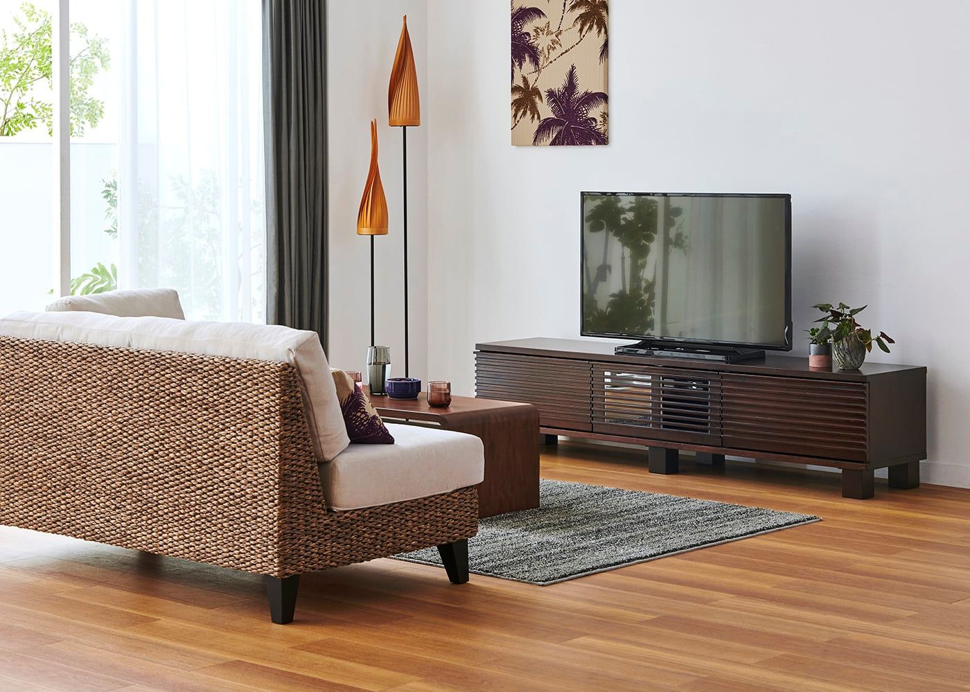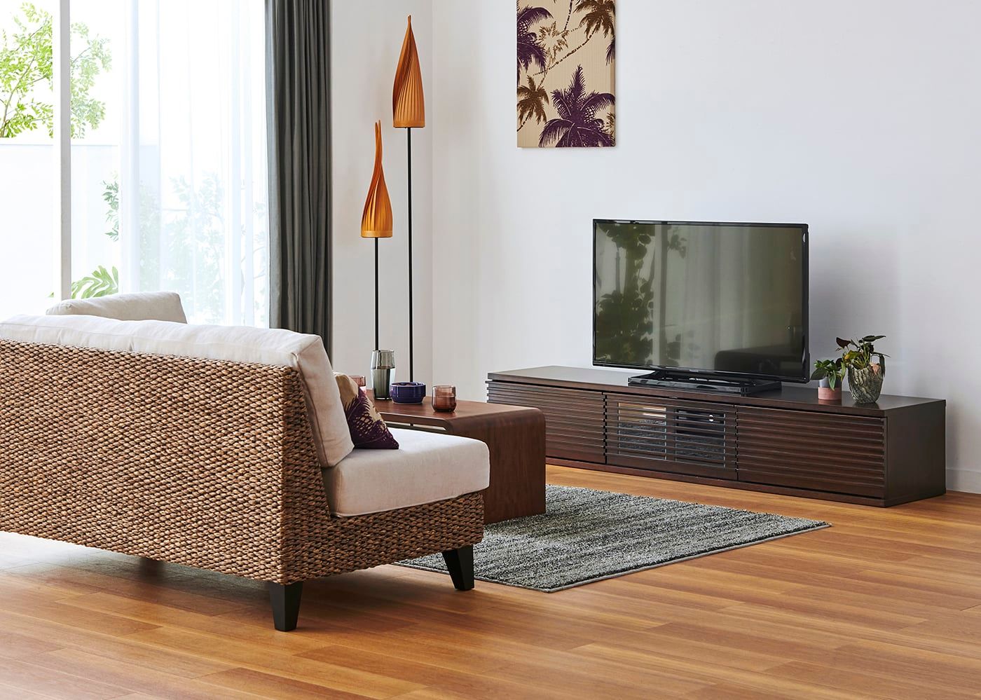 テレビボードは1540タイプ・フレームデザイン、ソファは幅1850mmの2.5人掛け