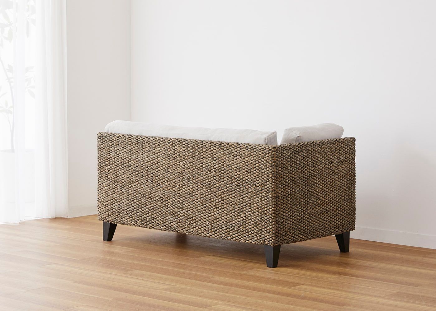 前面はもちろんのこと、背面やアーム側面などソファフレーム全体に編み込まれたヒヤシンス。丁寧に編み込まれた素材感や、光の当たり方による陰影などを視覚的に楽しむことができます。
