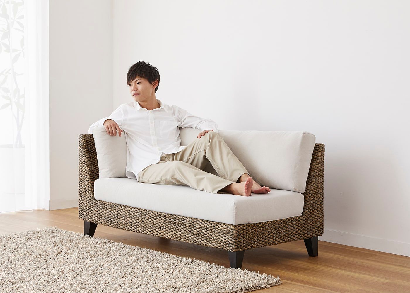 ソファをリビングルームに空間置きしても、片側がアームレスのため抜け感が生まれて、開放感のある部屋を作れます。また、綺麗に編み込まれた天然のヒヤシンス素材が映えます。