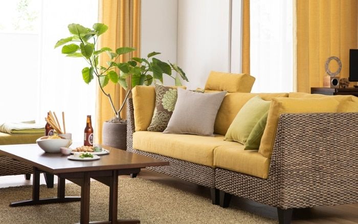 ヒヤシンス素材を活かした、明るくナチュラルな雰囲気のリビング。一見難しそうなイエローでも、存在感と自然の風合いを纏ったヒヤシンスなら上手くまとめることができ、おしゃれな雰囲気に仕上げてくれます。ビタミンカラーであるイエローに囲まれた暮らしは、毎日ポジティブに過ごせそうですね。