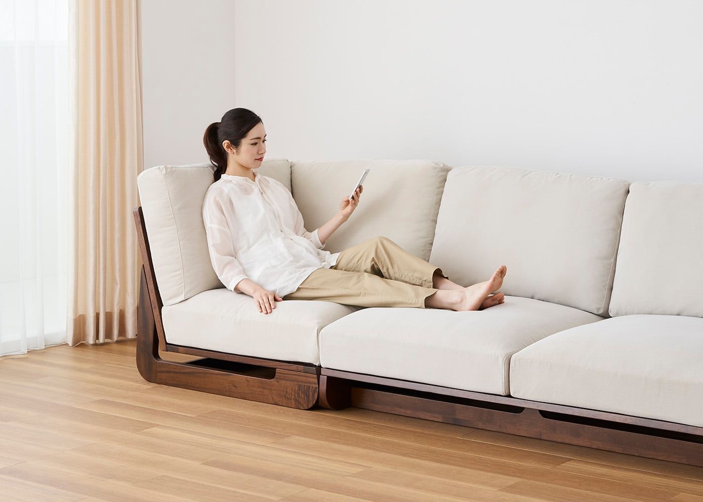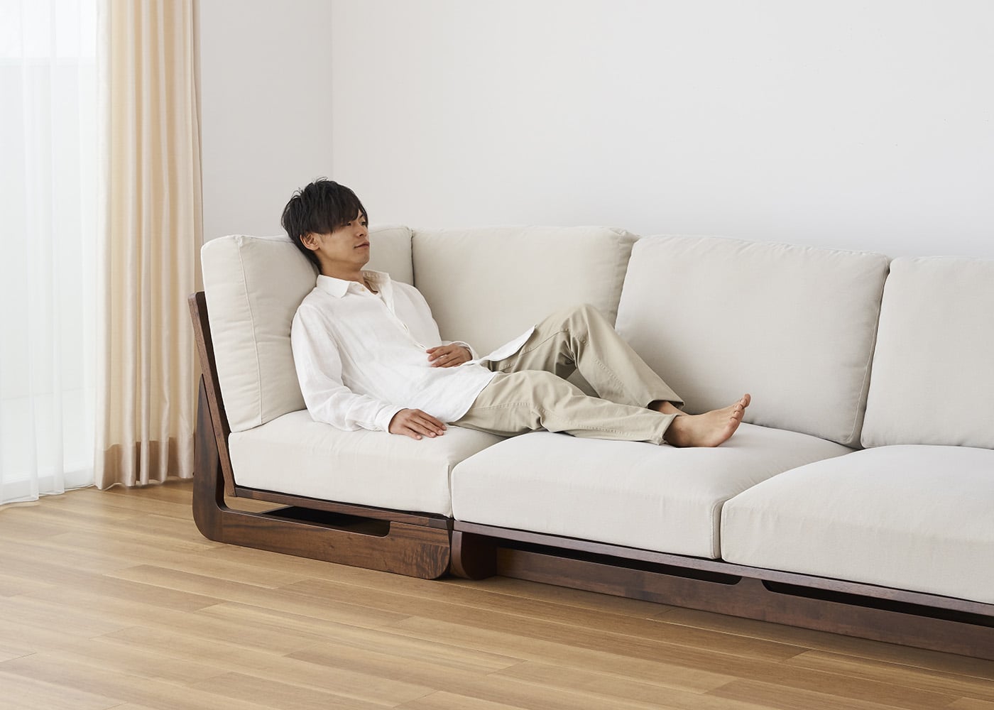 コーナーソファと片アームの座面スペースを贅沢に使って脚を伸ばしてくつろげるのが魅力です。(モデルは身長172cmの男性)