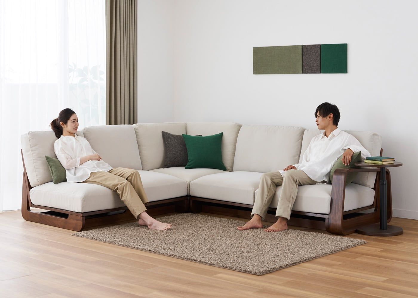 コーナーセットで組んだ場合でも、1人掛けソファをセパレートして使うことでコーナー部分に座って寛ぐこともできます。ゲストが来た時や過ごし方に合わせてレイアウトしてみましょう。