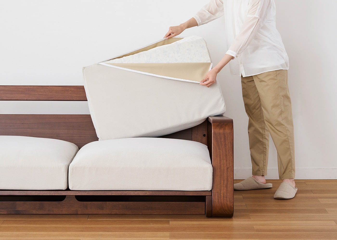 バッククッション、ボトムクッションのカバーはファスナー式で、カバーの取り外しや交換が可能です。ご自宅でもカバーの洗濯ができ、メンテナンス性に優れたソファです。
