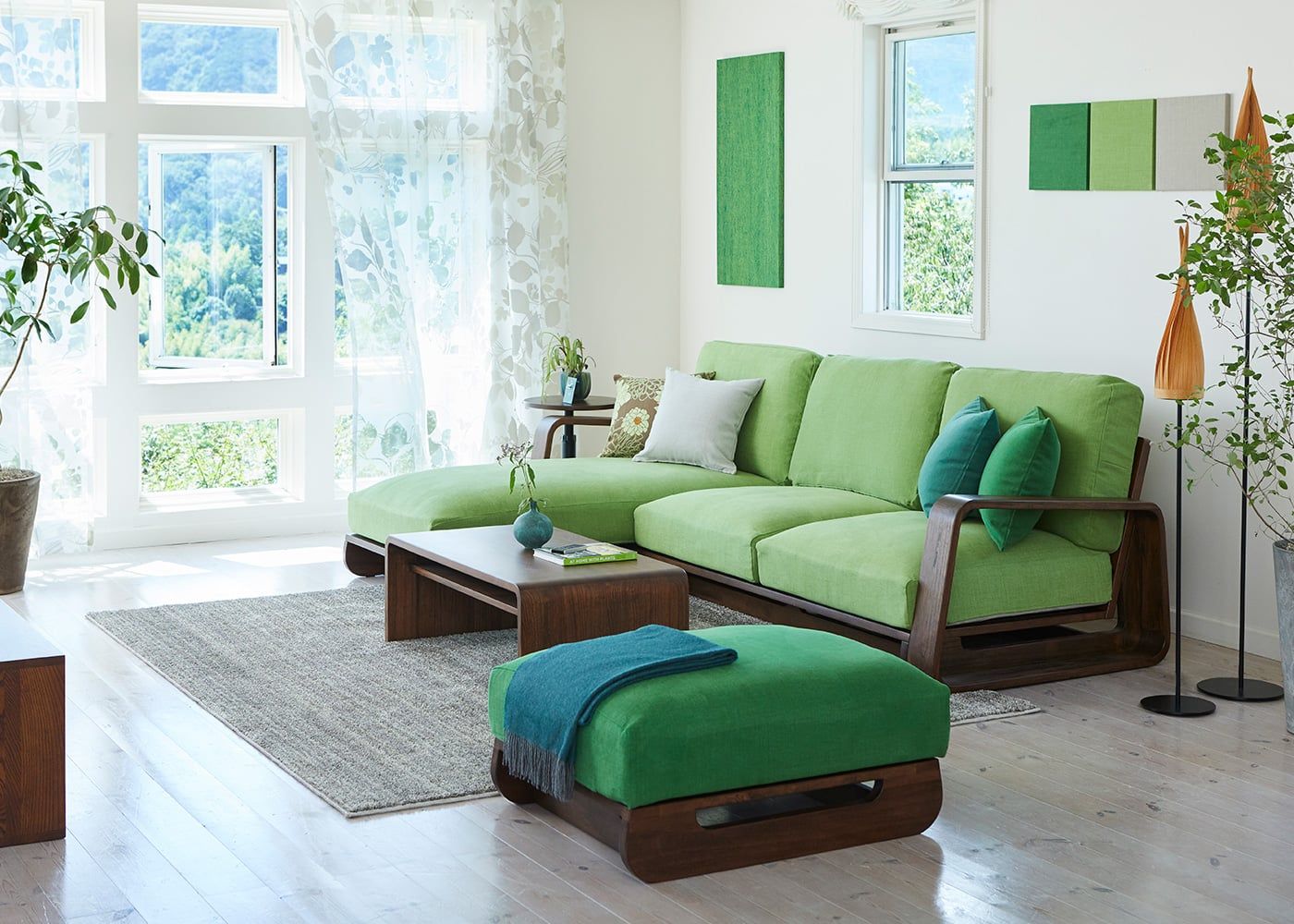 a.flatのソファはカバーの着せ替えができるのが魅力。約100色のファブリックから素材や色を選んで、あなただけのカラーコーディネートをお楽しみください。(別売、受注生産)