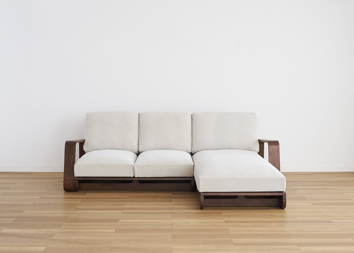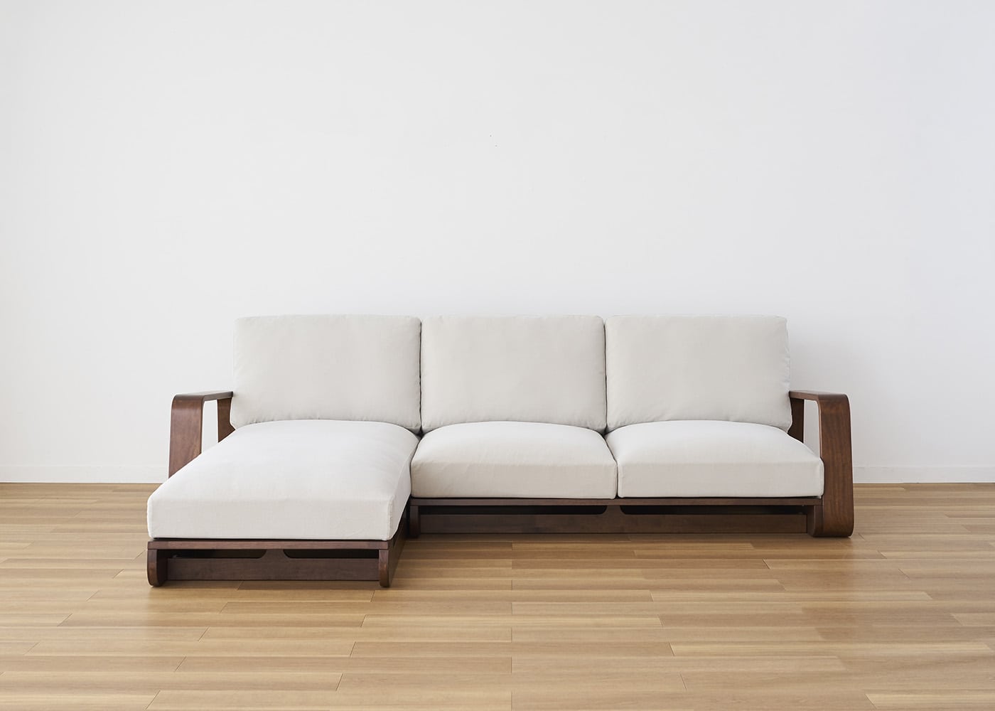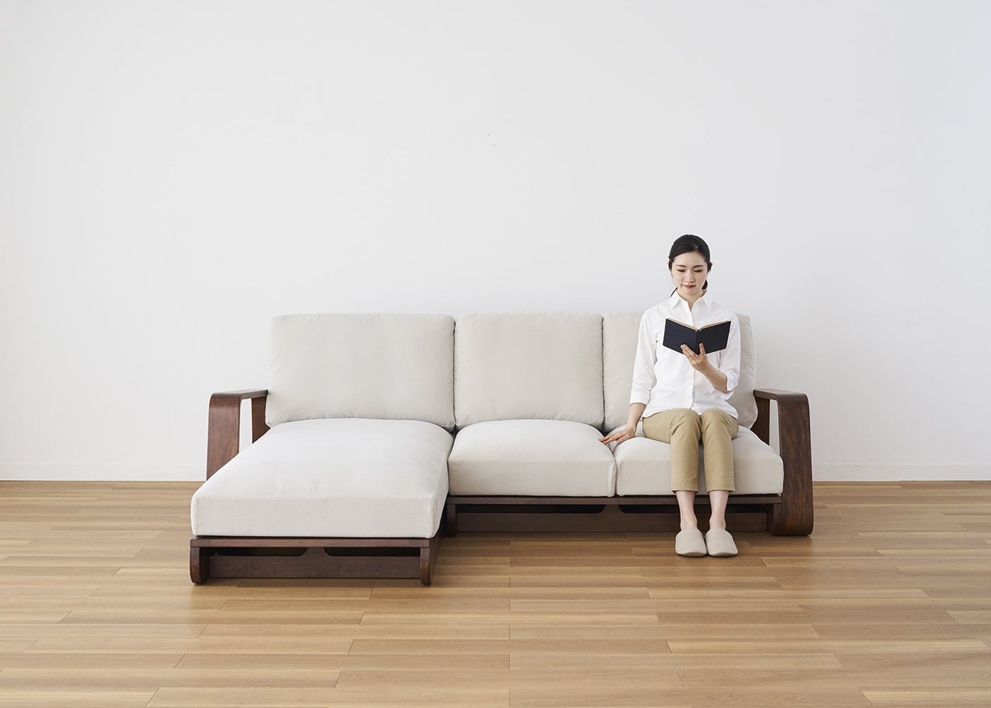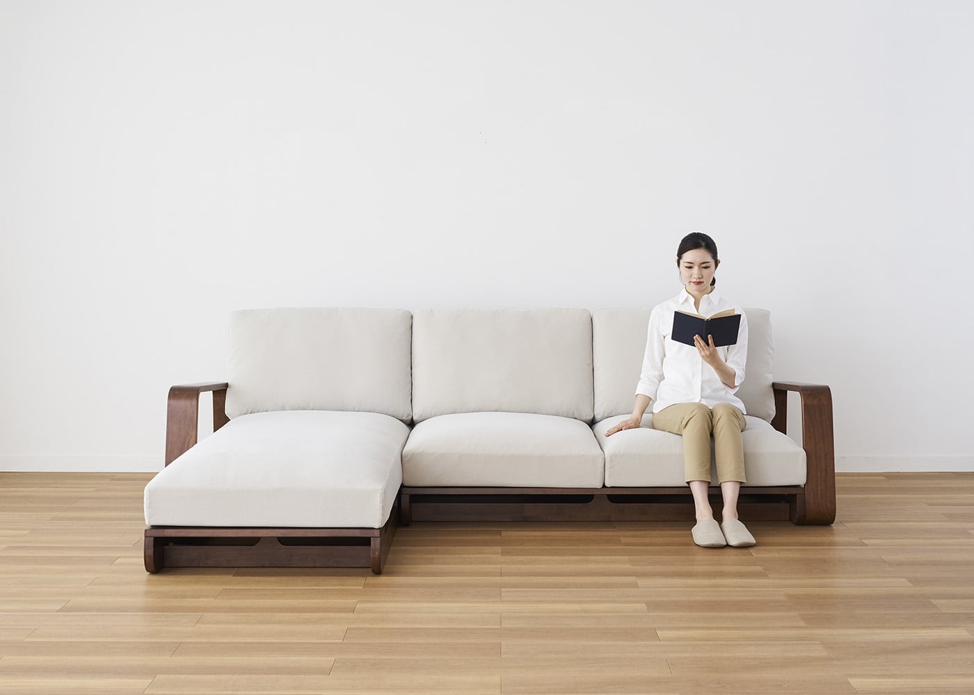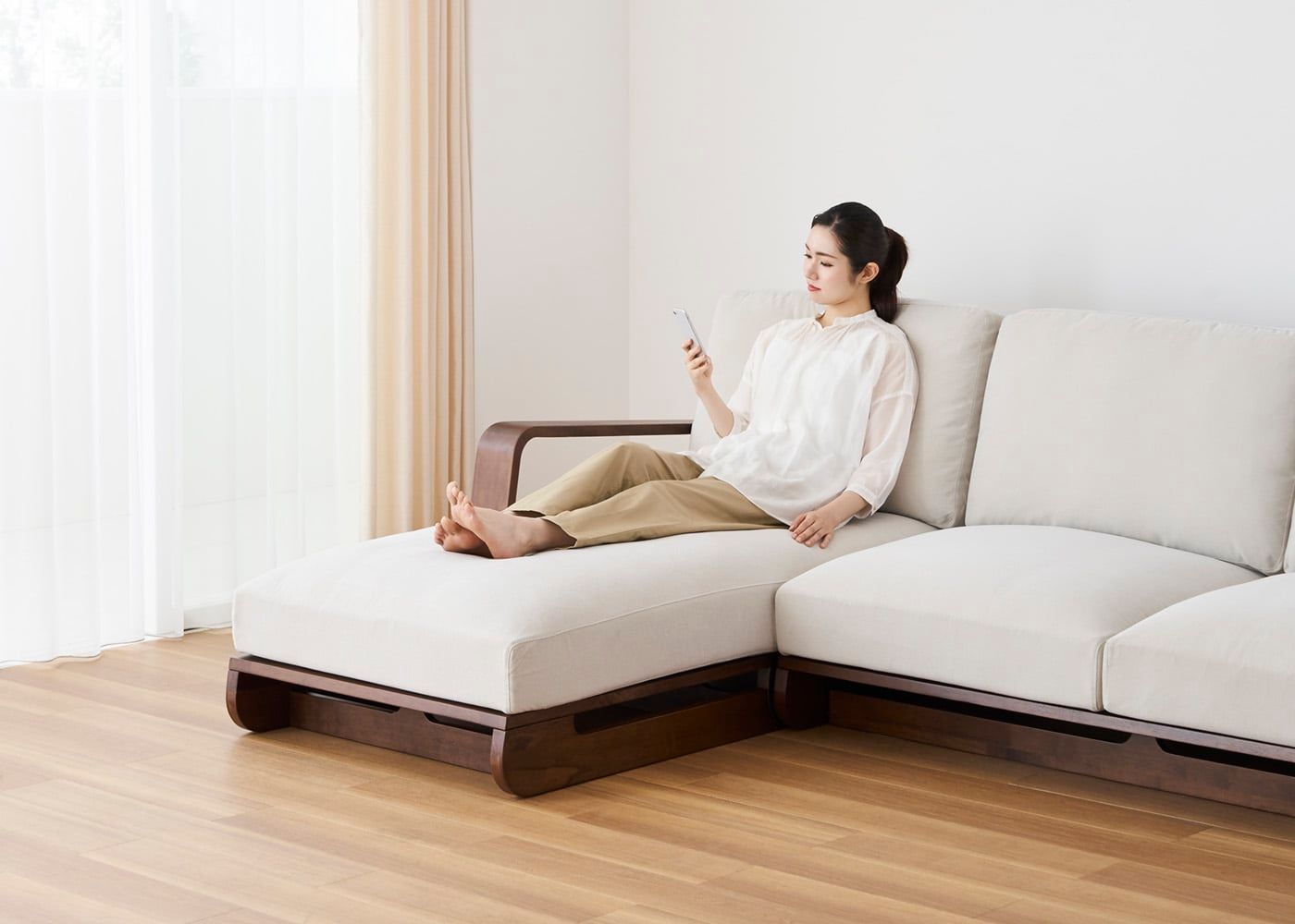 もう一つの特徴として、アーム着脱機能があります。アームを着脱することで、お部屋の間取り・家族構成の変化に合わせてソファを組み替えできます。カウチソファの位置を左右入れ替えることもできます。あなたのライフステージと共に歩むソファです。
