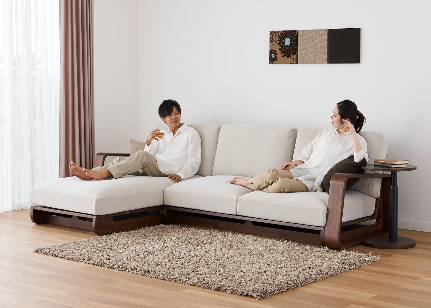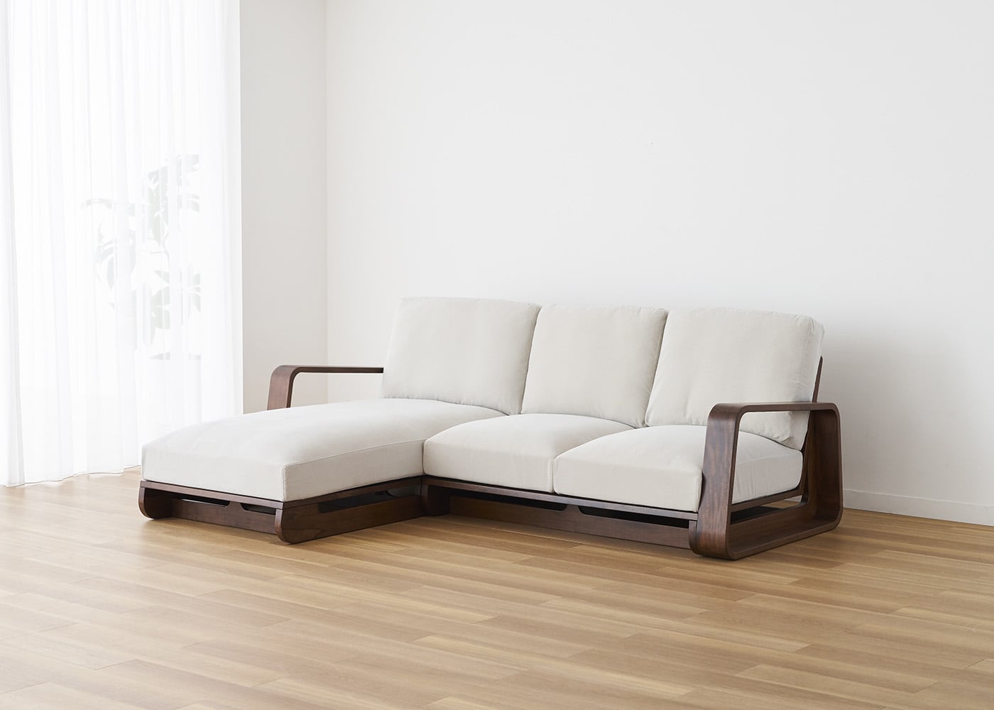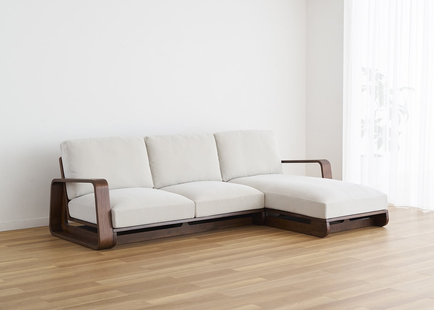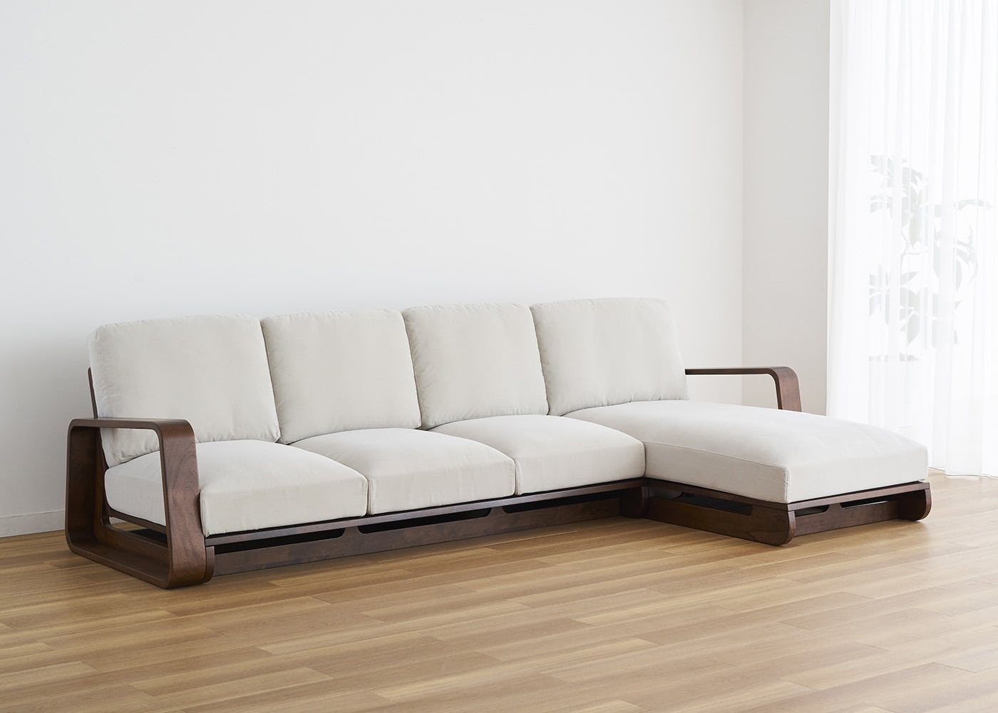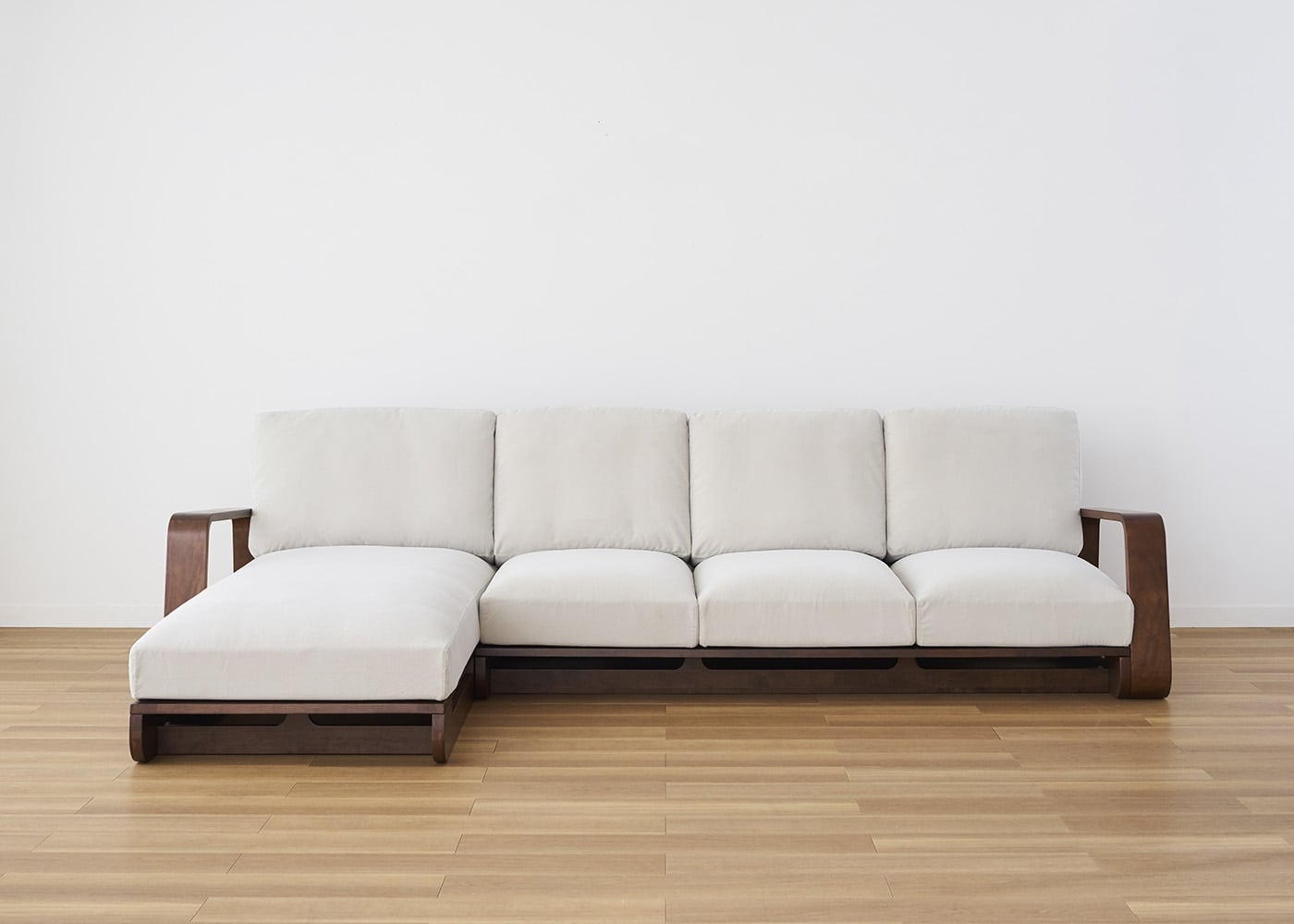 もう一つの特徴として、アーム着脱機能があります。アームを着脱することで、お部屋の間取り・家族構成の変化に合わせてソファを組み替えできます。カウチソファの位置を左右入れ替えることもできます。あなたのライフステージと共に歩むソファです。