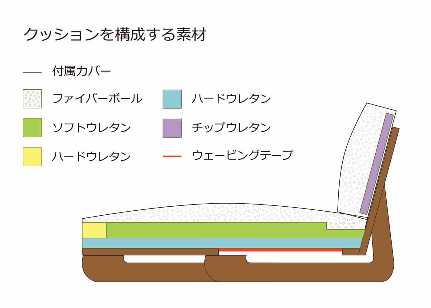 座り心地は「腰から肩・首・足までやさしく支える」をテーマに設計しました。座面と背もたれのクッションは、硬さの違う素材で構成されています。やさしい感触としっかりと体を支える感覚とを両立した上質な座り心地を実現しました。