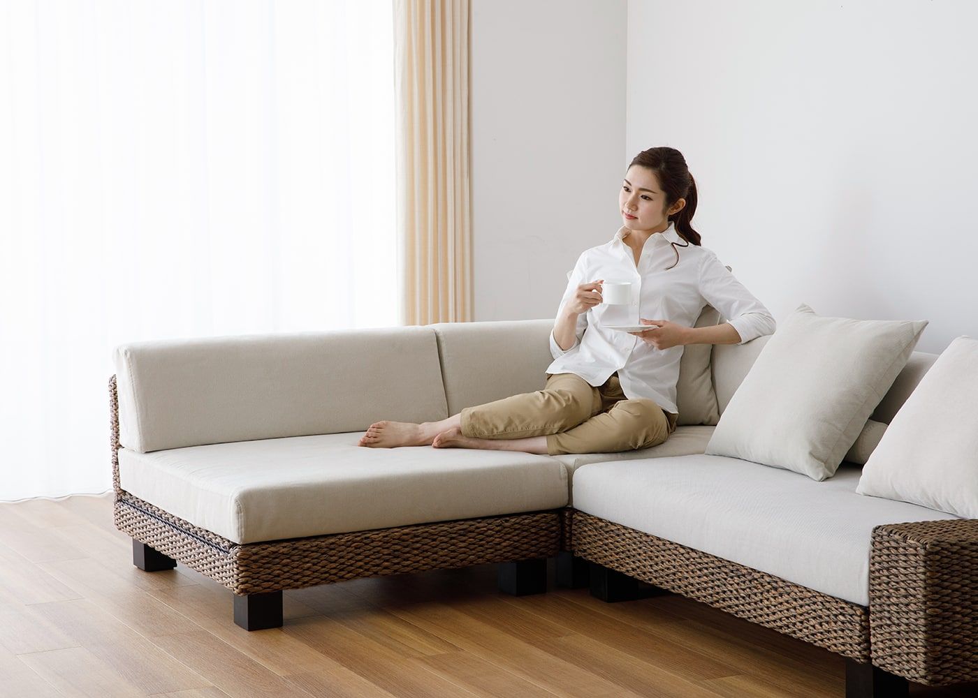 しっかりとした硬さの座面と優しく支えてくれる背のクッションに身体を預ければ、リゾートのような心地よい時間を味わえます。コーナーソファセットで非日常感のある寛ぎを叶えてみては?(モデルは身長167cmの女性)