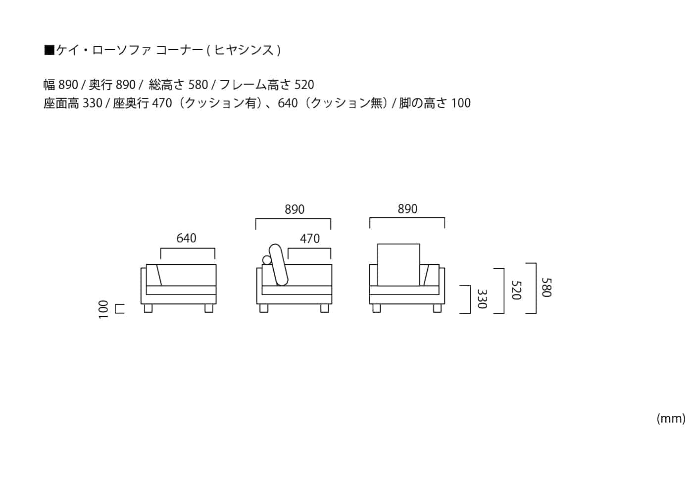 幅890 / 奥行890 / 高さ580 / 座面高330 / 座奥行640