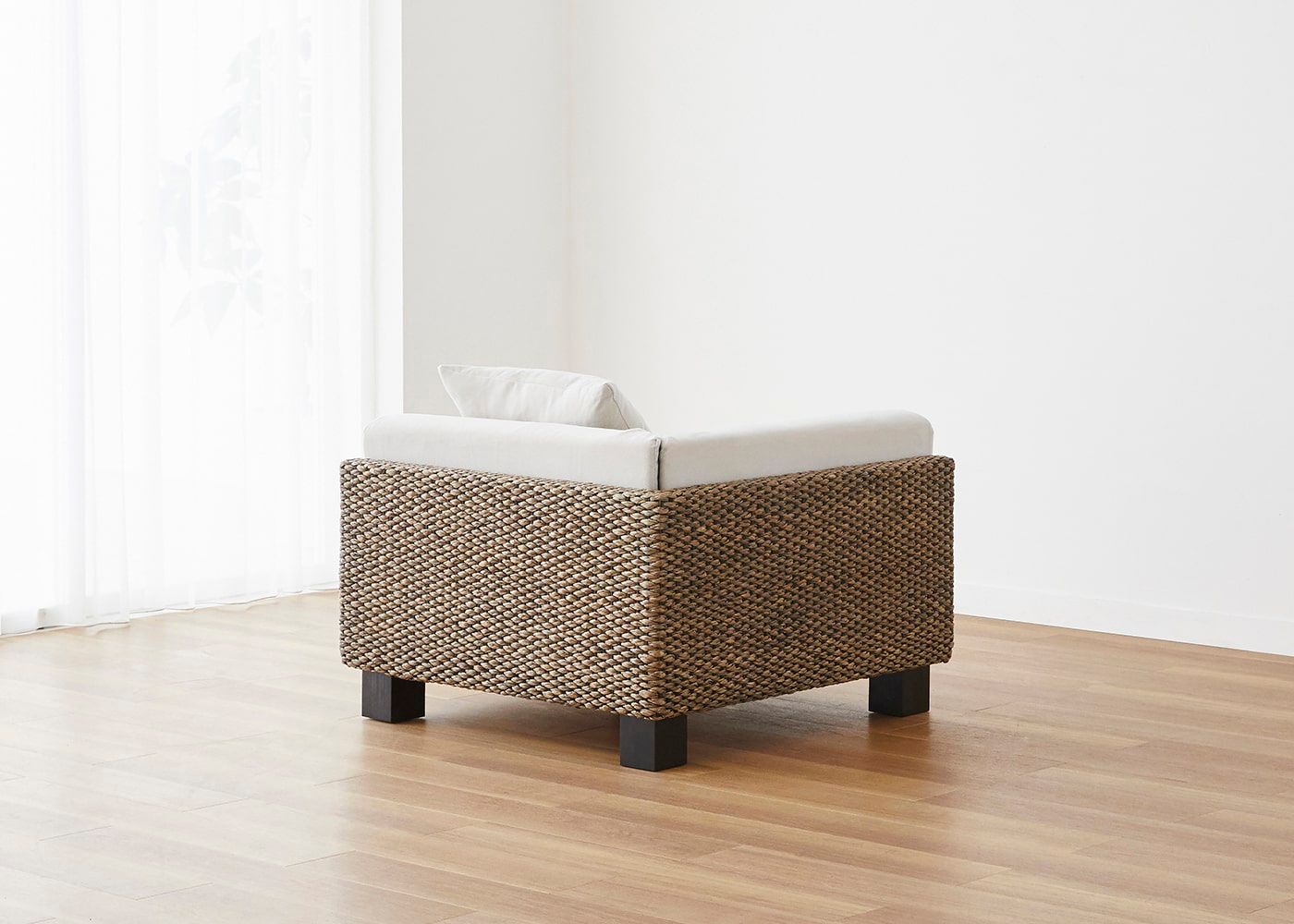 ケイ・ローソファは後ろから見ても美しく、抜け感のあるデザインが魅力です。丁寧に編み込まれたヒヤシンス素材が、圧迫感なくおしゃれな空間を演出します。