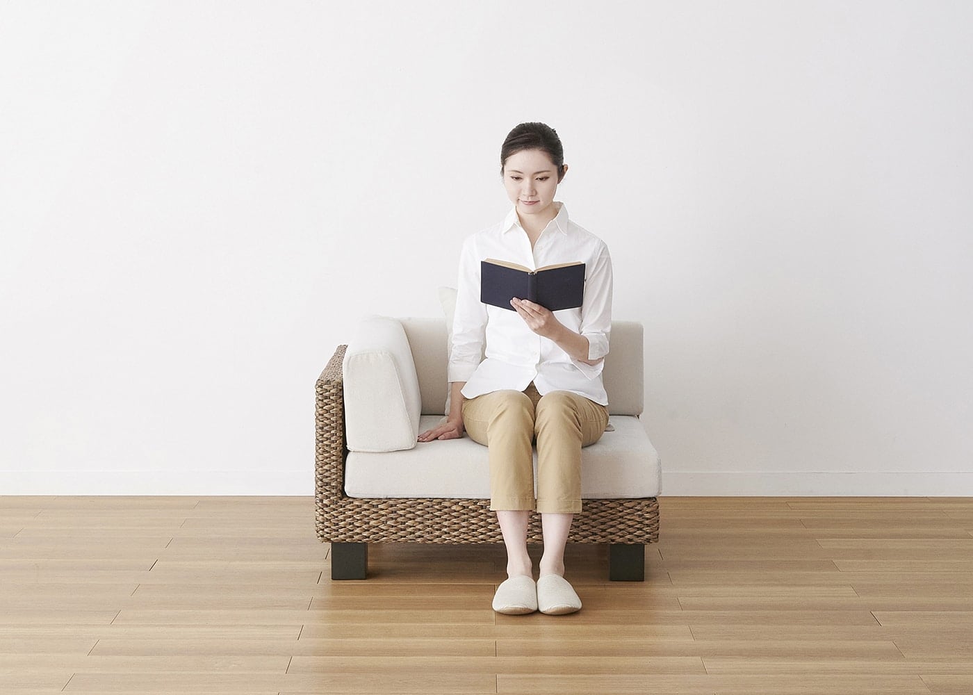 お子様がいる家庭や床で過ごす方に最適なロータイプのソファです。日本人の体型やライフスタイルに合わせたサイズ感で、ゆったりと身体を預けられる快適な座り心地を実現しています。(写真はコーナーソファ、モデルは身長167cmの女性)