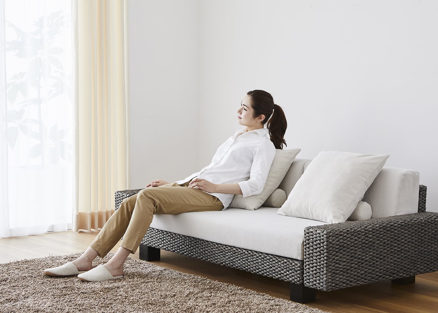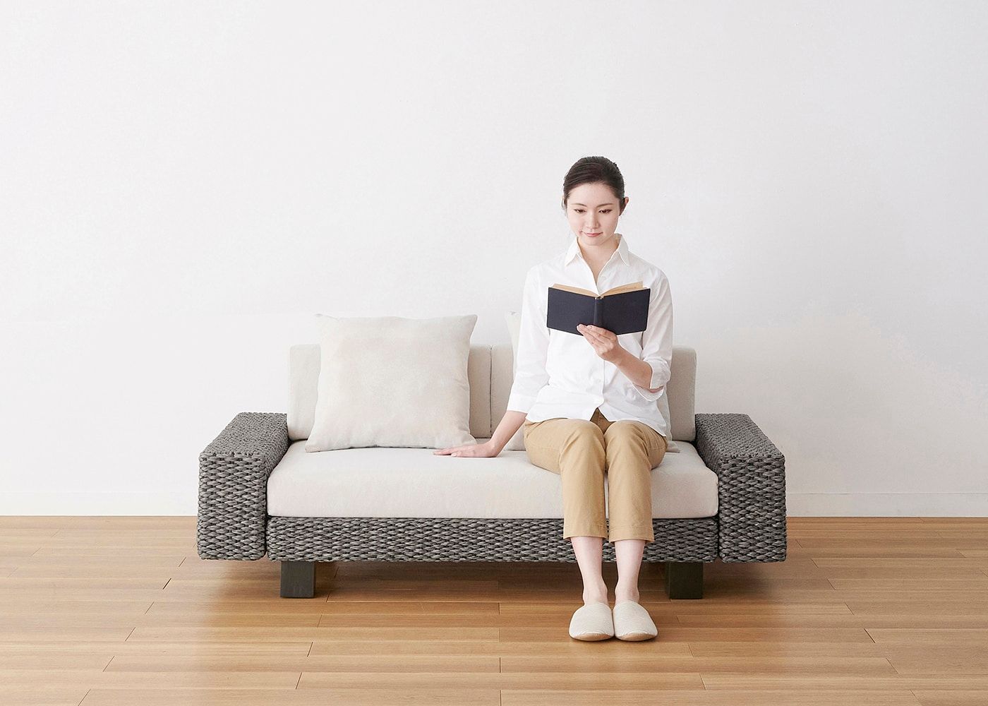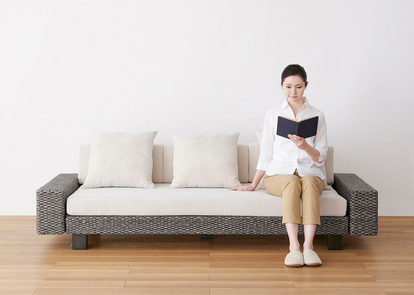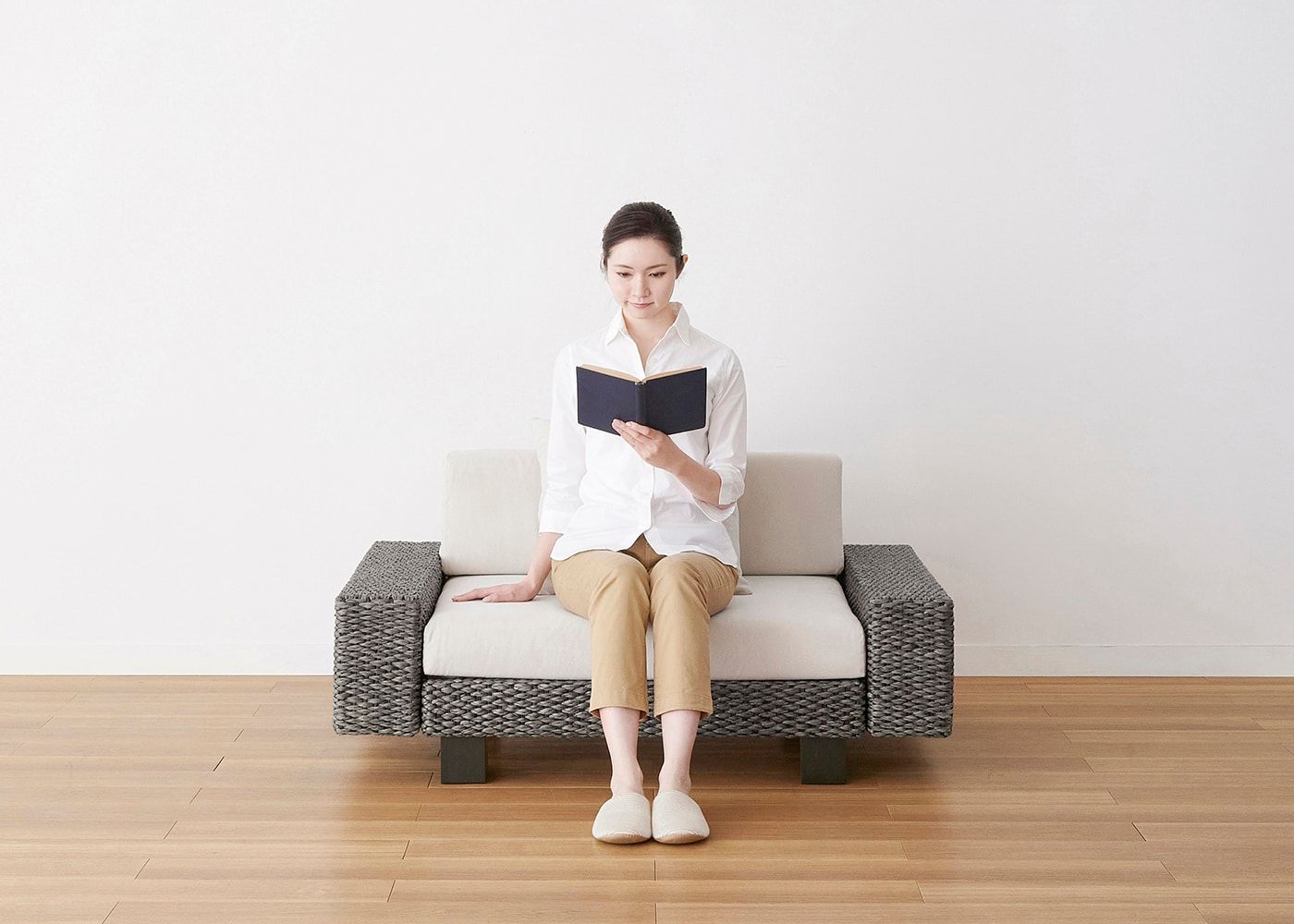 a.flatのソファはカバーの着せ替えができるのが魅力。約100色のファブリックから素材や色を選んで、あなただけのカラーコーディネートをお楽しみください。(別売、受注生産)