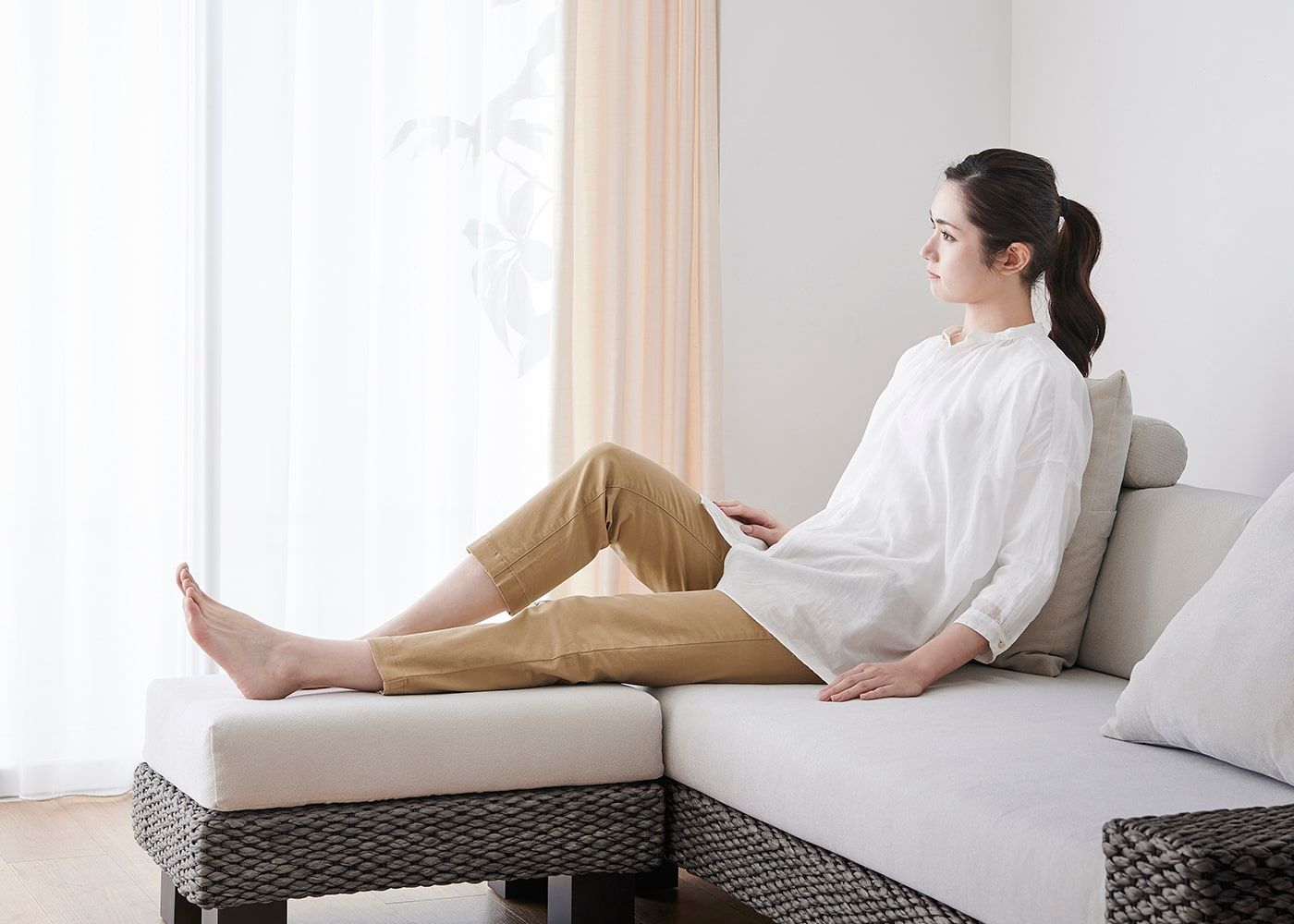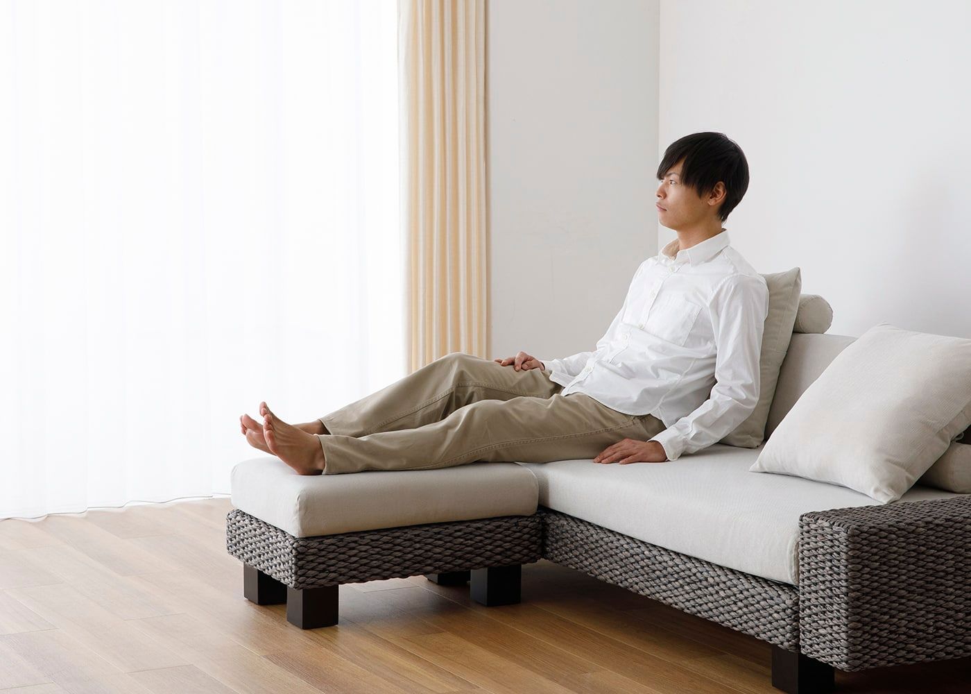 ソファの前に置いて脚を伸ばすことでリラックスでき、座面が腰から足先までしっかり支えます。これにより、負荷が一点に集中せず、体圧を均等に分散して快適に過ごすことが可能です。(写真は