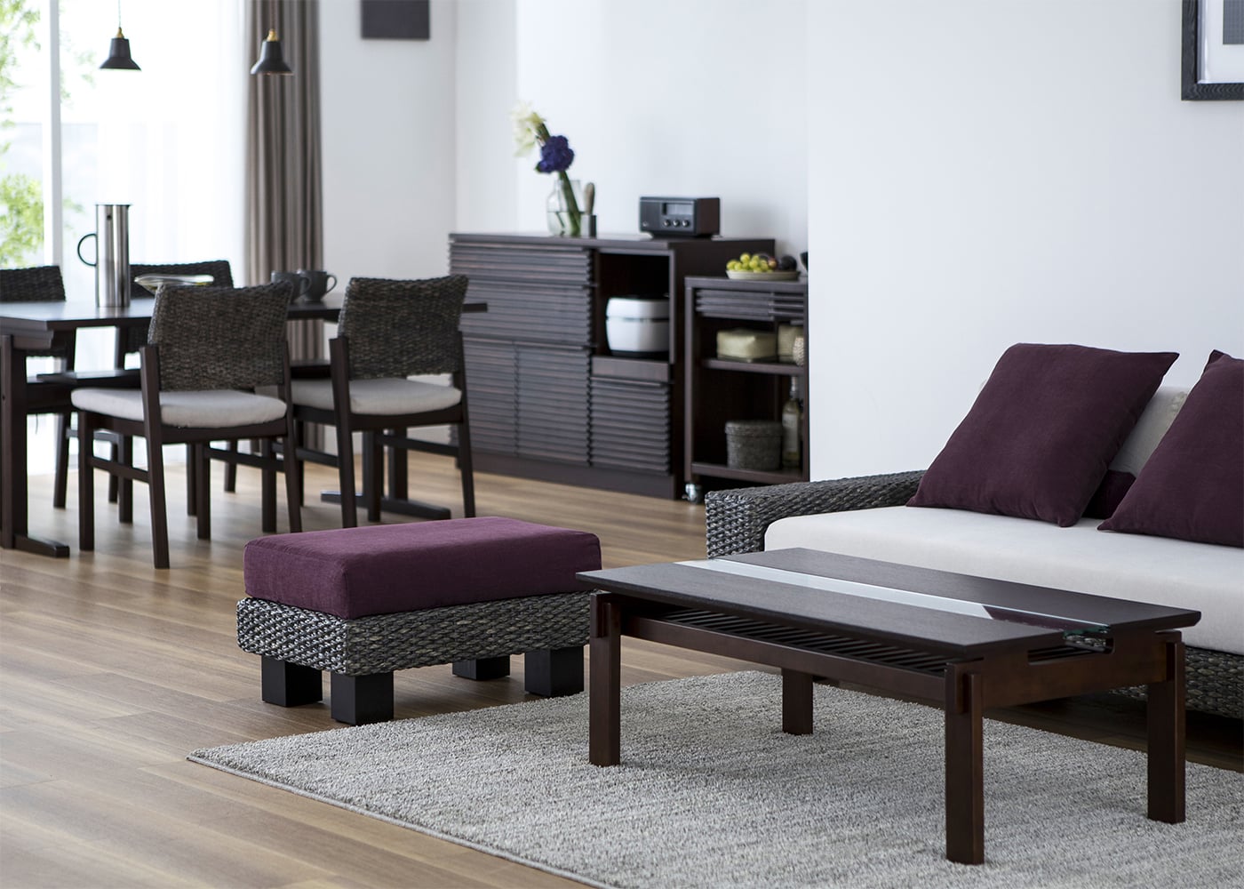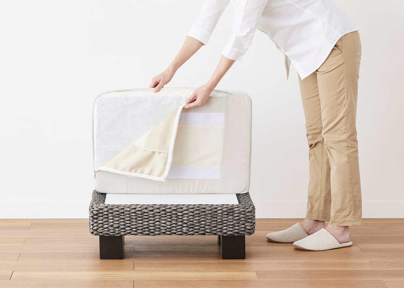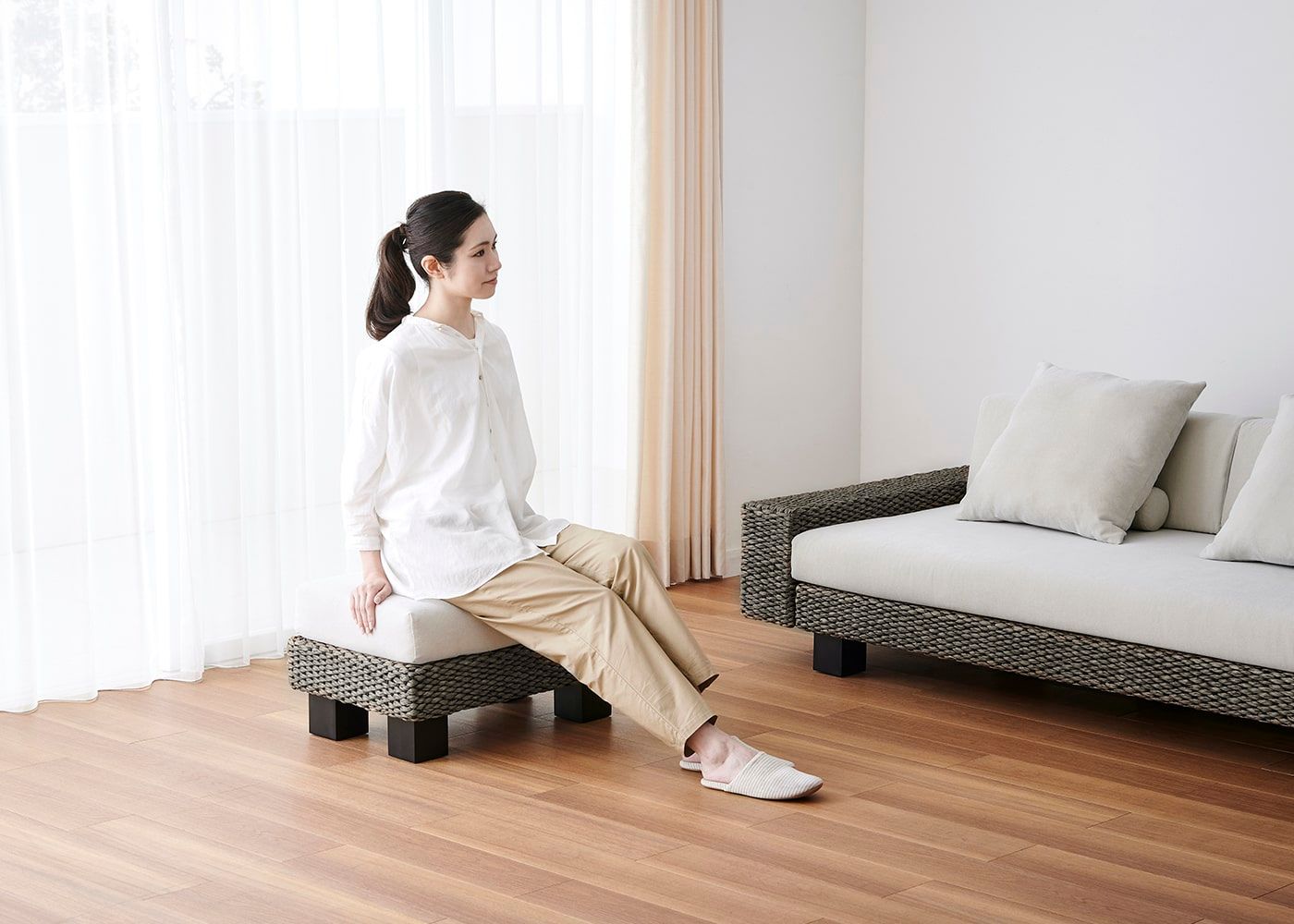 リビングダイニングで家族やゲストと過ごす際、ソファ横に置くことでスツール代わりに。弾力性のある座面が腰をしっかり支え、脚乗せとしても使えるオットマンは、暮らしをより充実させてくれます。(写真のオットマンカバーは
