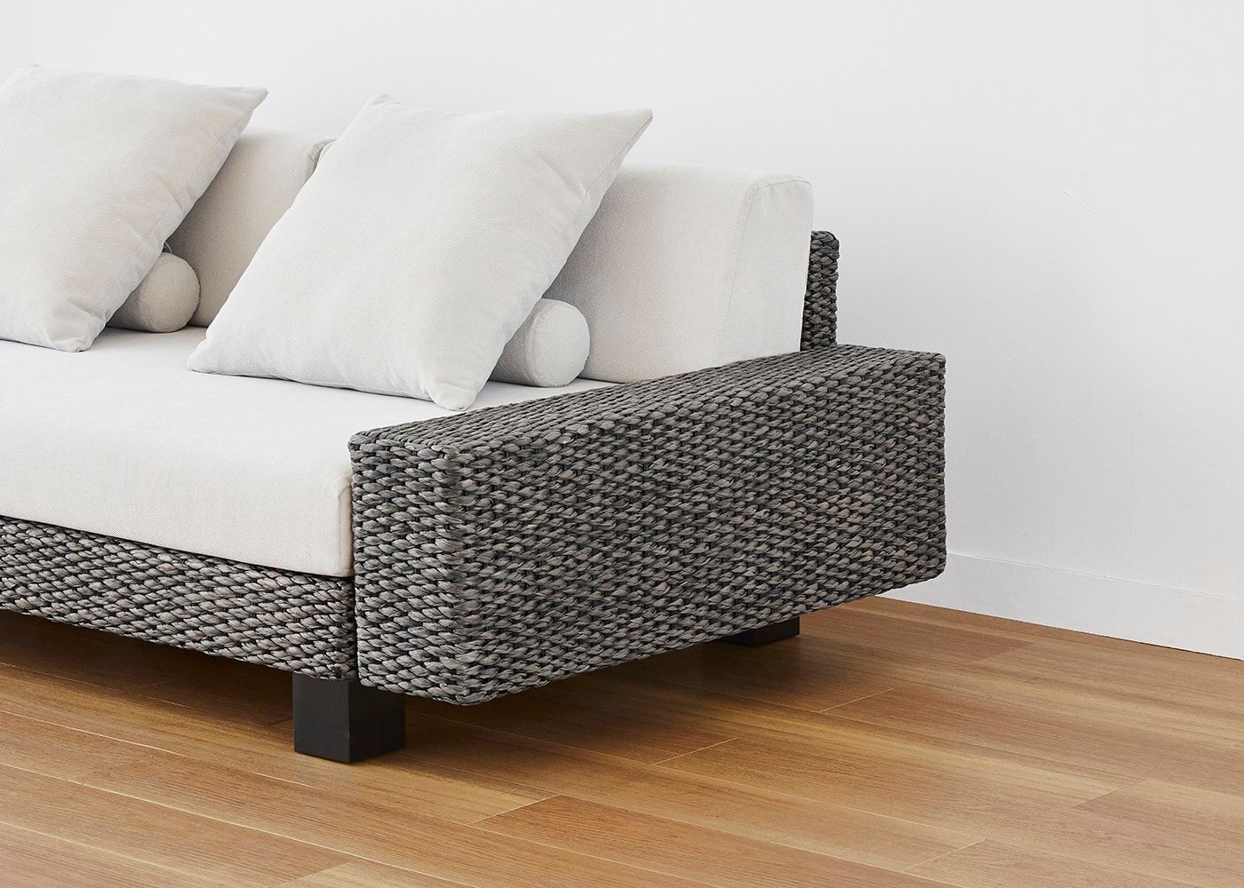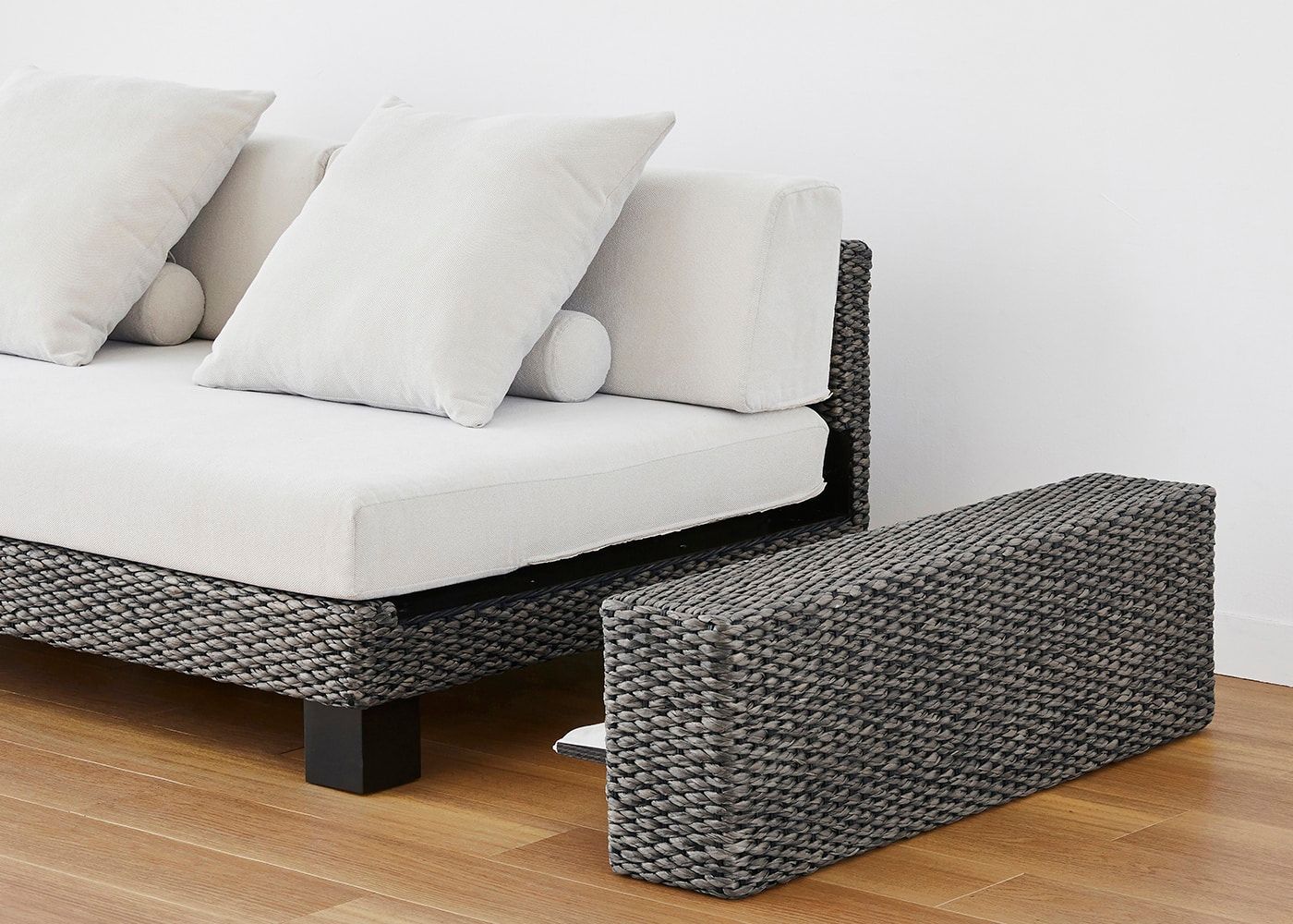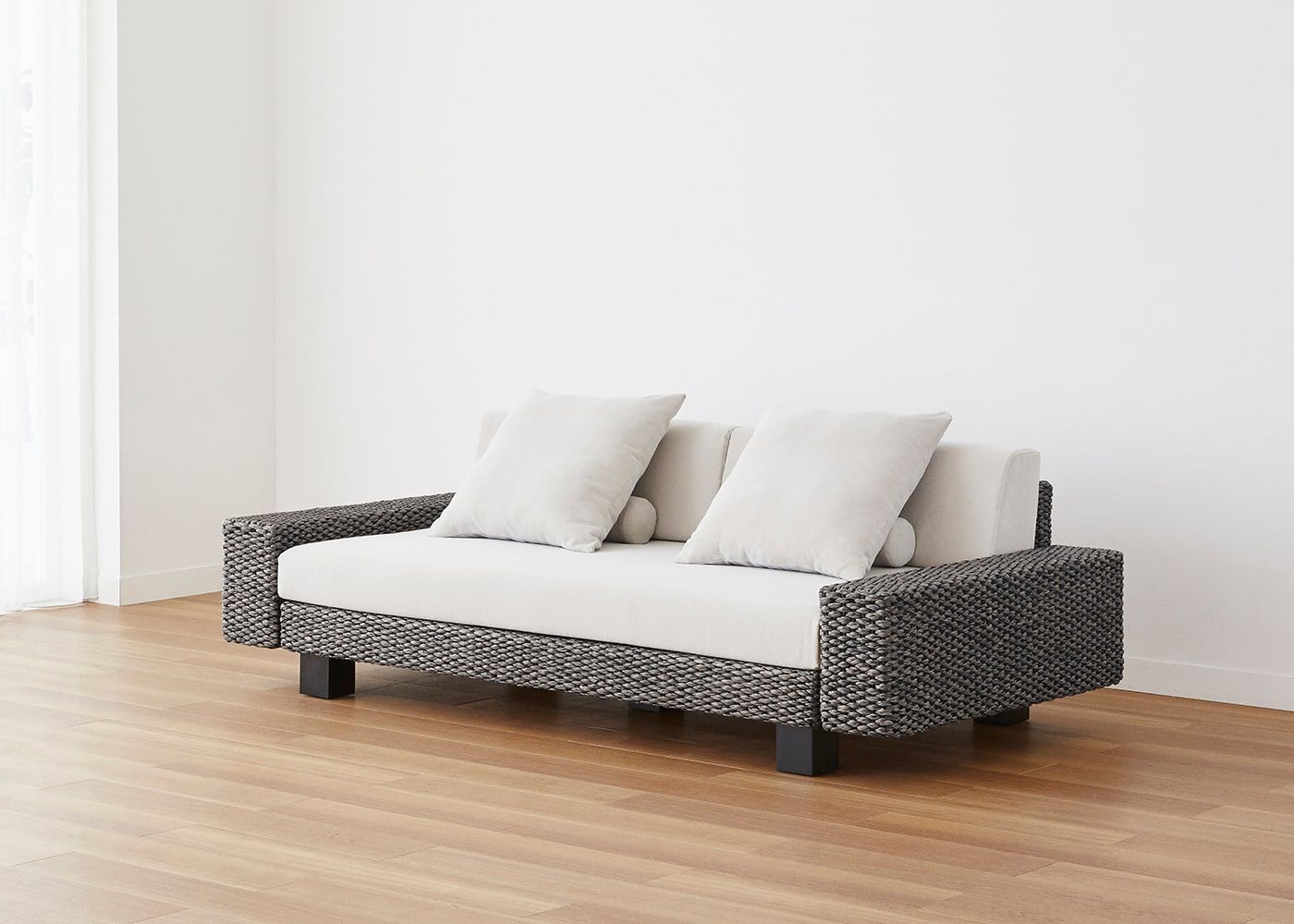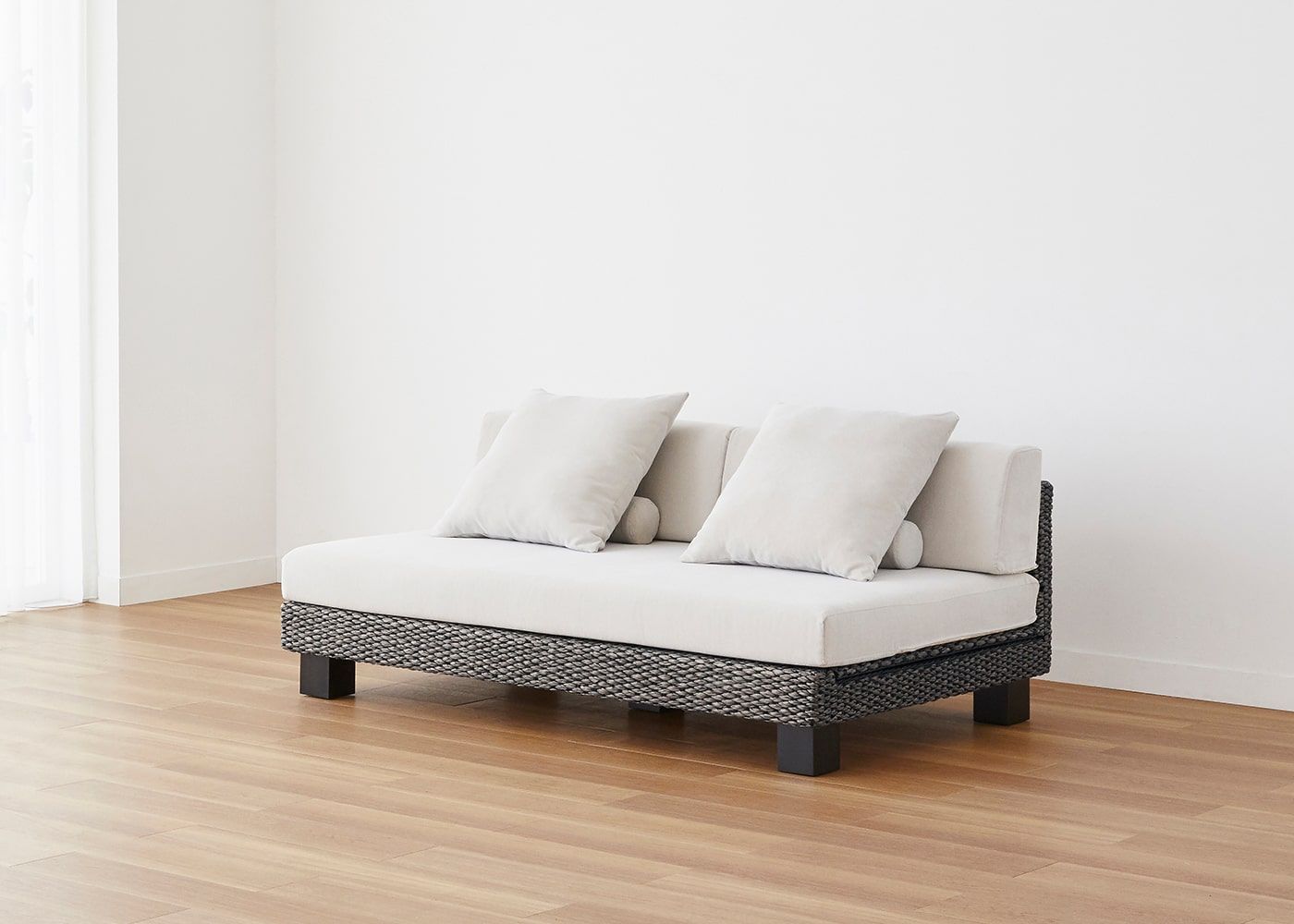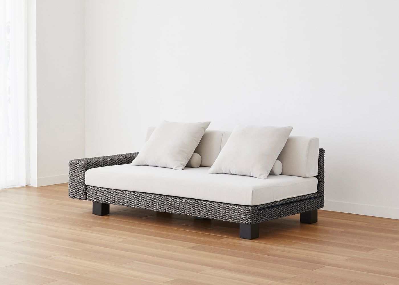 更に片側のアームも外して、組み替えれば開放感抜群のベンチタイプにもなります。また後日にアーム有りタイプに戻すこともできるので、しばらく使用しないアームは自宅で保管をしておきましょう。(写真はケイ・ローソファ