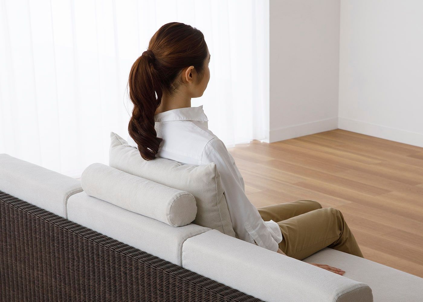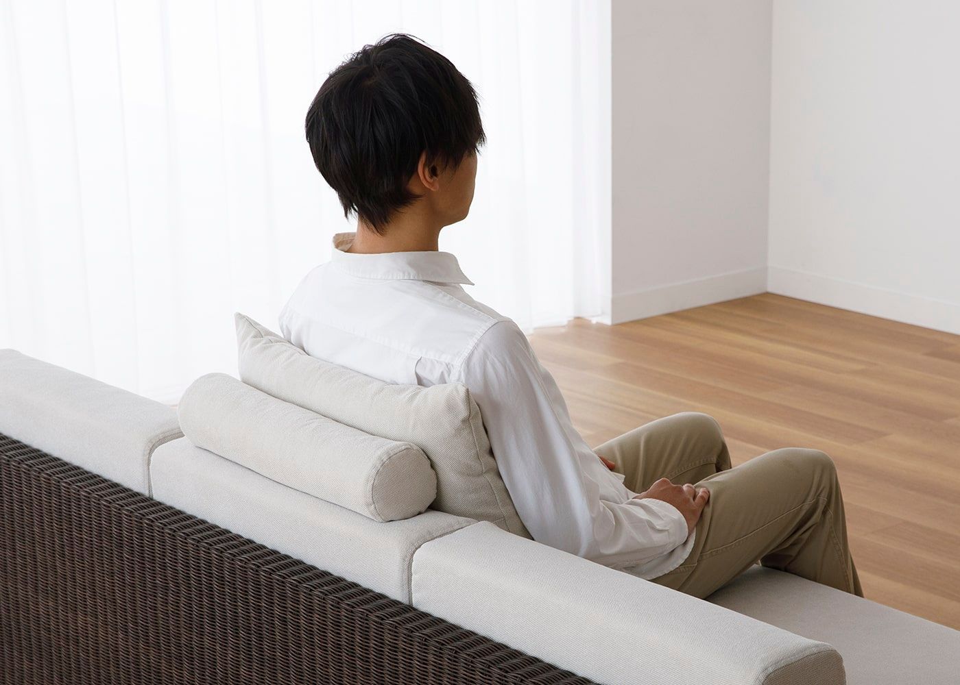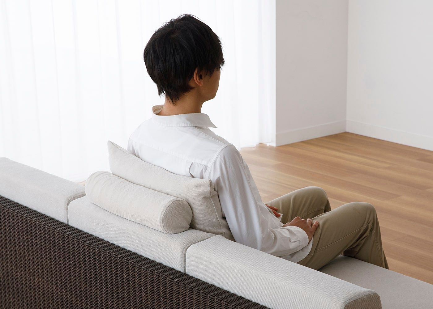 筒状のクッションを背クッションの上に置いて座ることで、背もたれの低いローソファでも背中から肩までゆったりと支えてくれます。(写真はケイ・ローソファに付属されているノーマルタイプ)