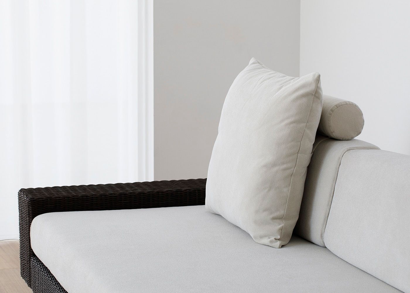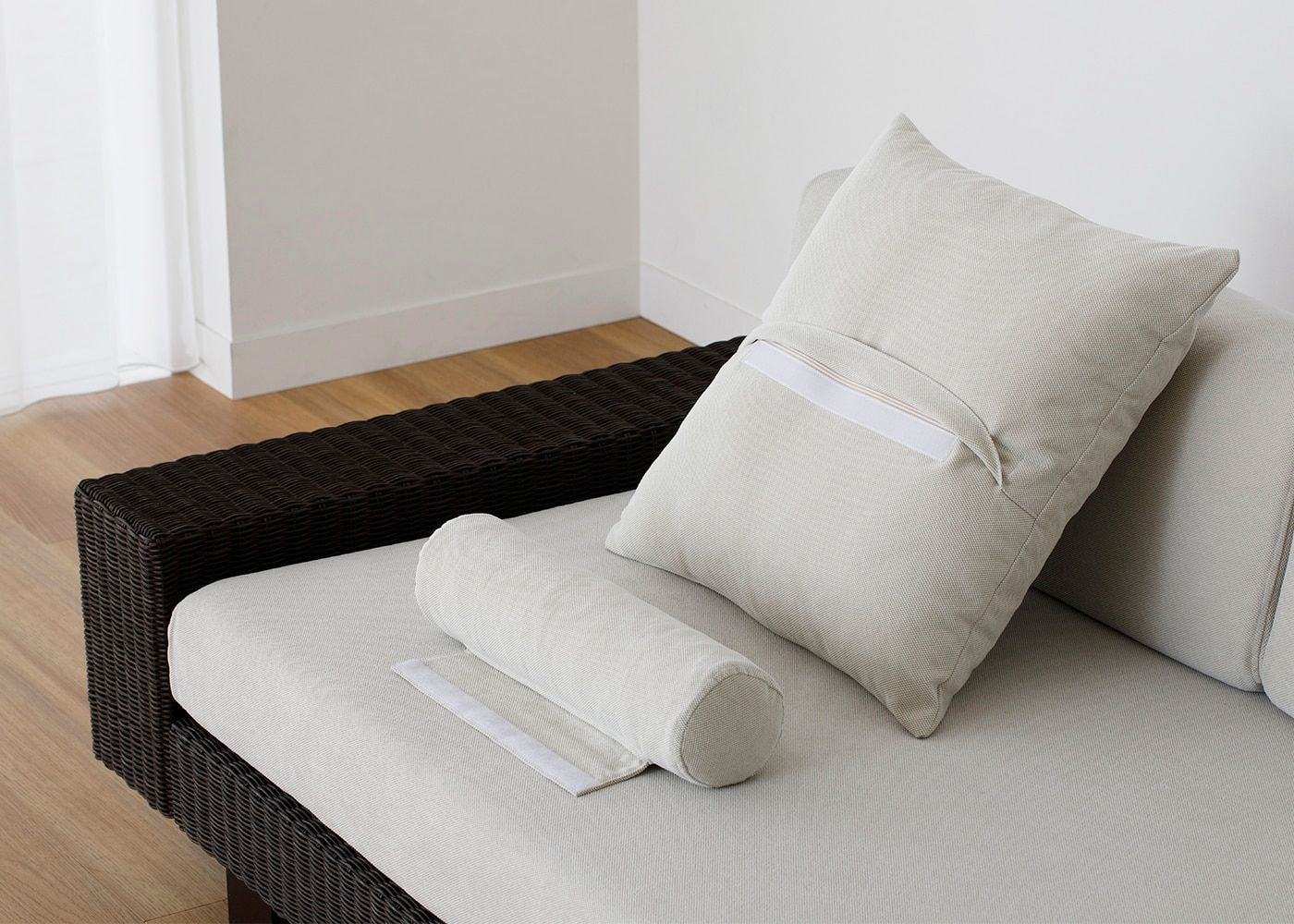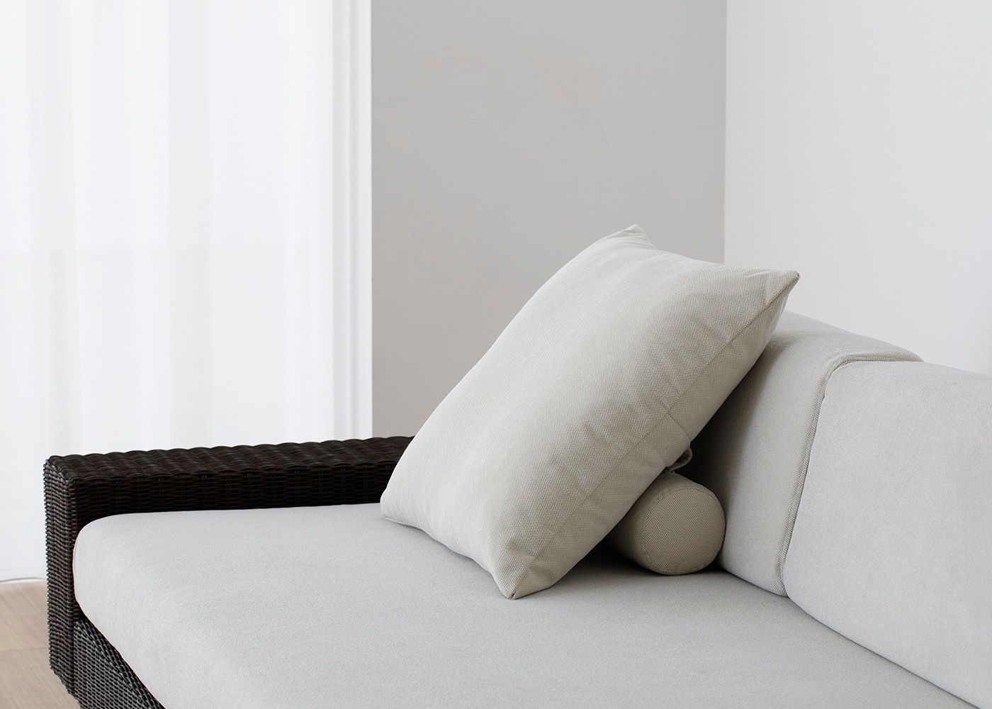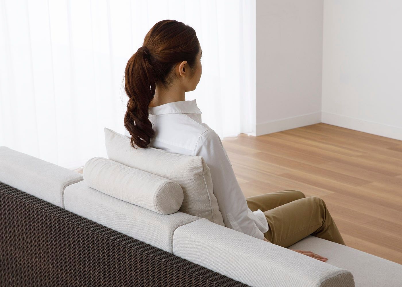 筒状のクッションを背クッションの上に置いて座ることで、背もたれの低いローソファでも背中から肩までゆったりと支えてくれます。(写真はケイ・ローソファに付属されているノーマルタイプ)