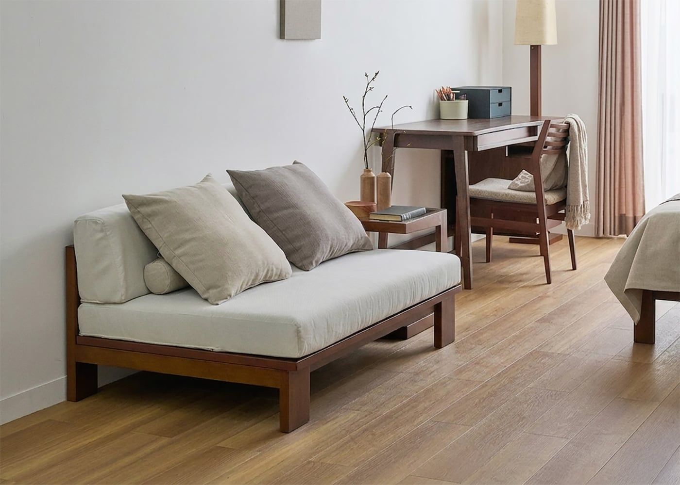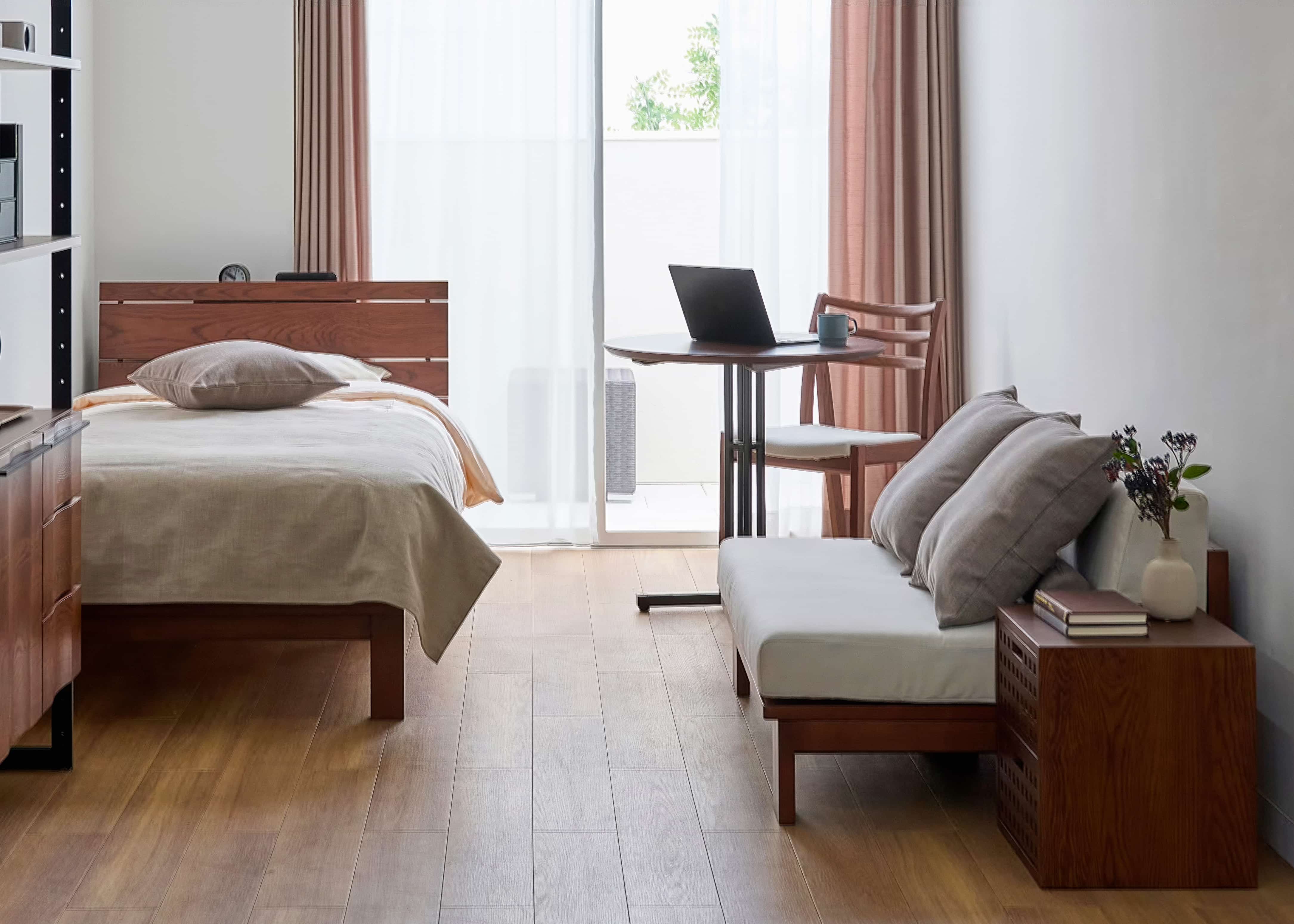 背もたれでしっかり寛げる一方、アームがないことでお部屋に抜け感が生まれ、ワンルームでも圧迫感を与えません。横からスムーズに立ち座りができるため動線も塞がず、限られたスペースを広々と効率的に使えます。≫このコーディネート例を画像一覧で見る