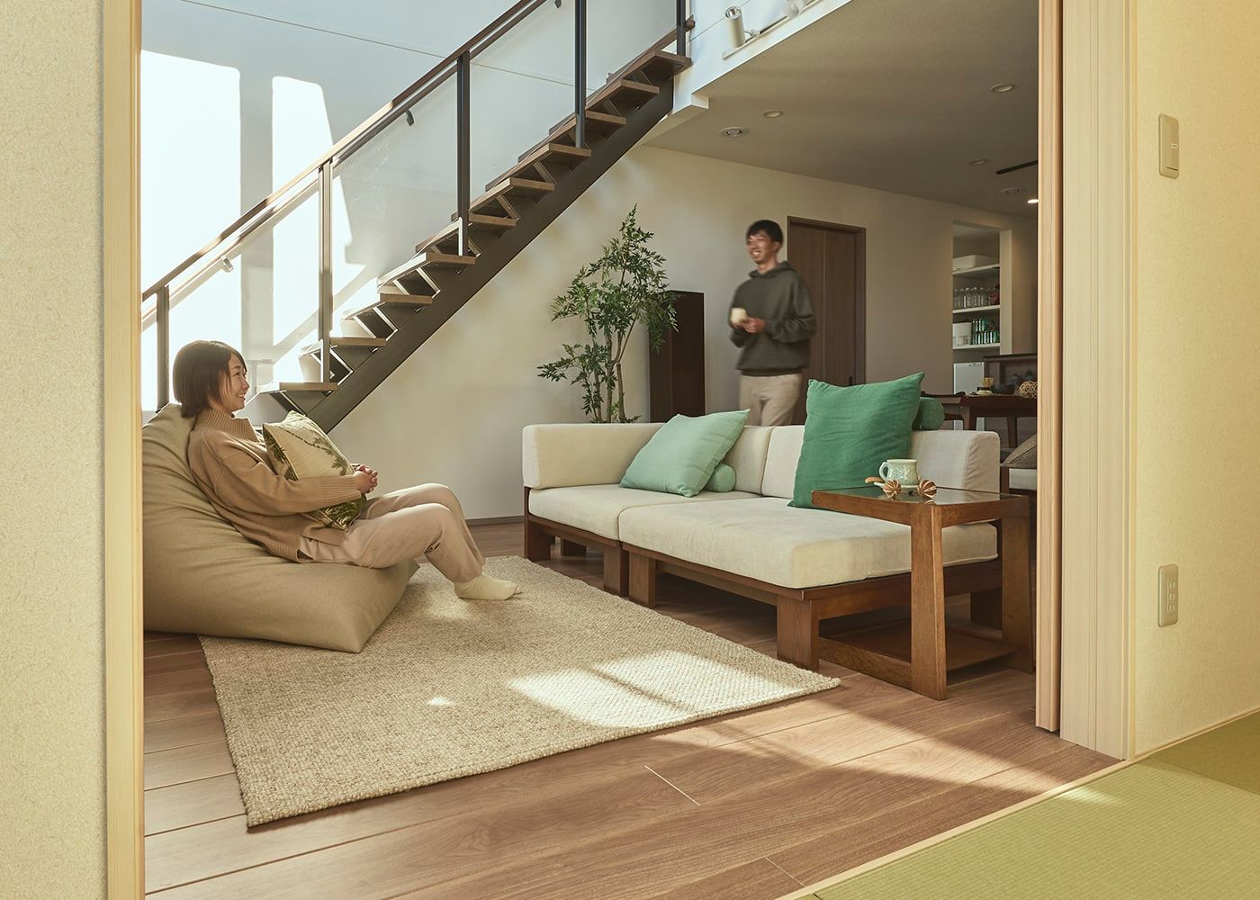 吹き抜けにローソファが広がる開放的なリビングと、隣合った和室との寛ぎ目線を揃えることで低さが心地良い落ち着いた空間に。ナチュラルカラーの空間を引き締めるダークブラウンの粋な階段は、建具のコントラストでスタイルを融合させたジャパンディ風リビングに仕上げています。≫このコーディネート例を画像一覧で見る