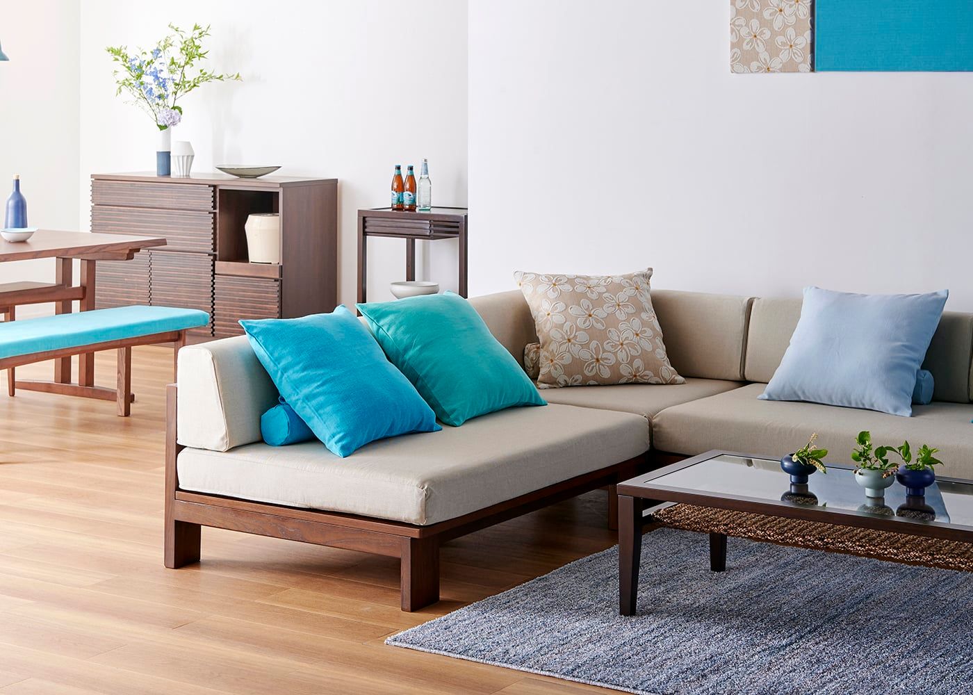 セイル・ローソファ ベンチは大きめサイズのローテーブルと合わせた、床座の暮らしとも相性抜群です。ソファとダイニングスペースを兼用にした、ロースタイルのソファダイニング生活を楽しんでください。(写真は3人掛け ベンチとモク・ローテーブル1500の組み合わせ)